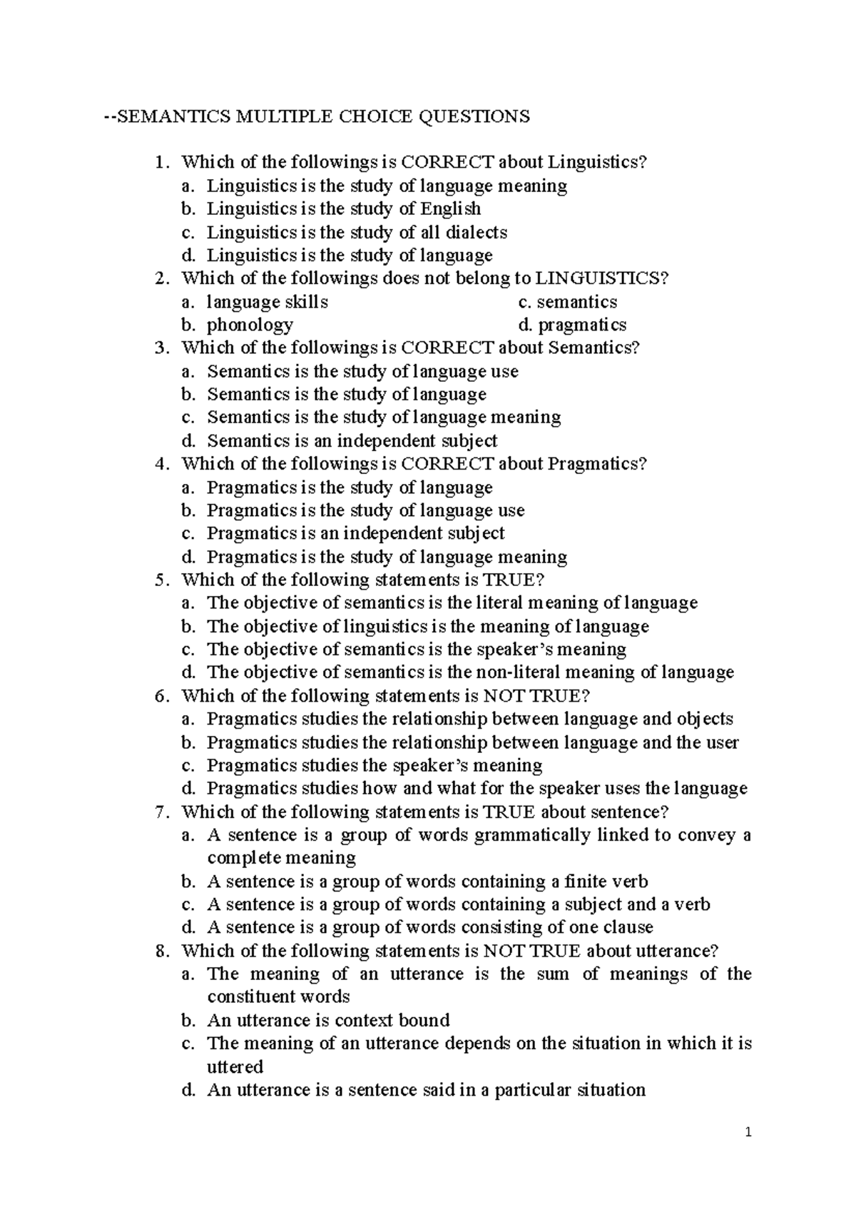 Semantics MCQs for Linguistics Course: Test Your Knowledge - Studocu