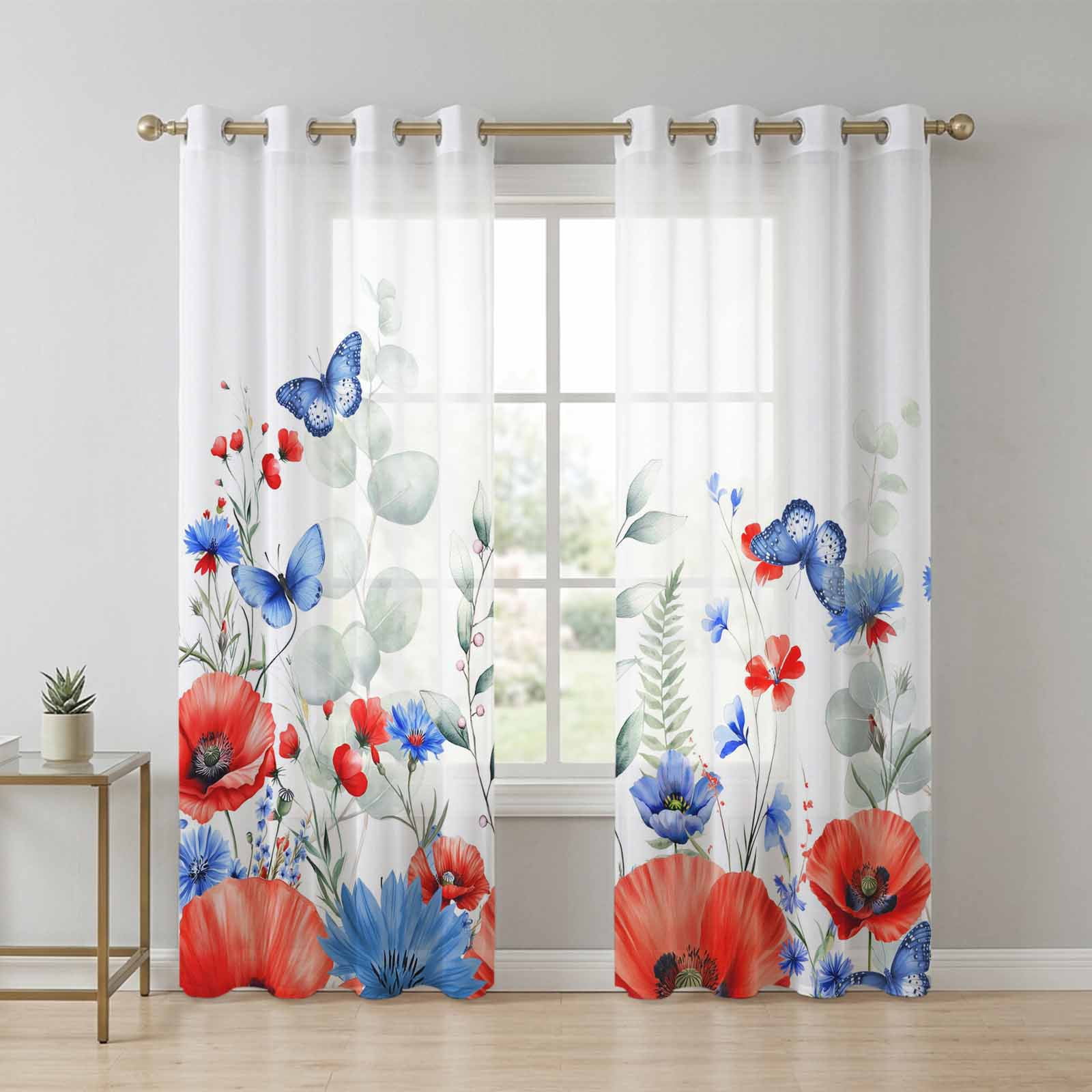 Blue Red Flowers Sheer Curtains 72 Inch Long 2 Panels, Eucalyptus ...