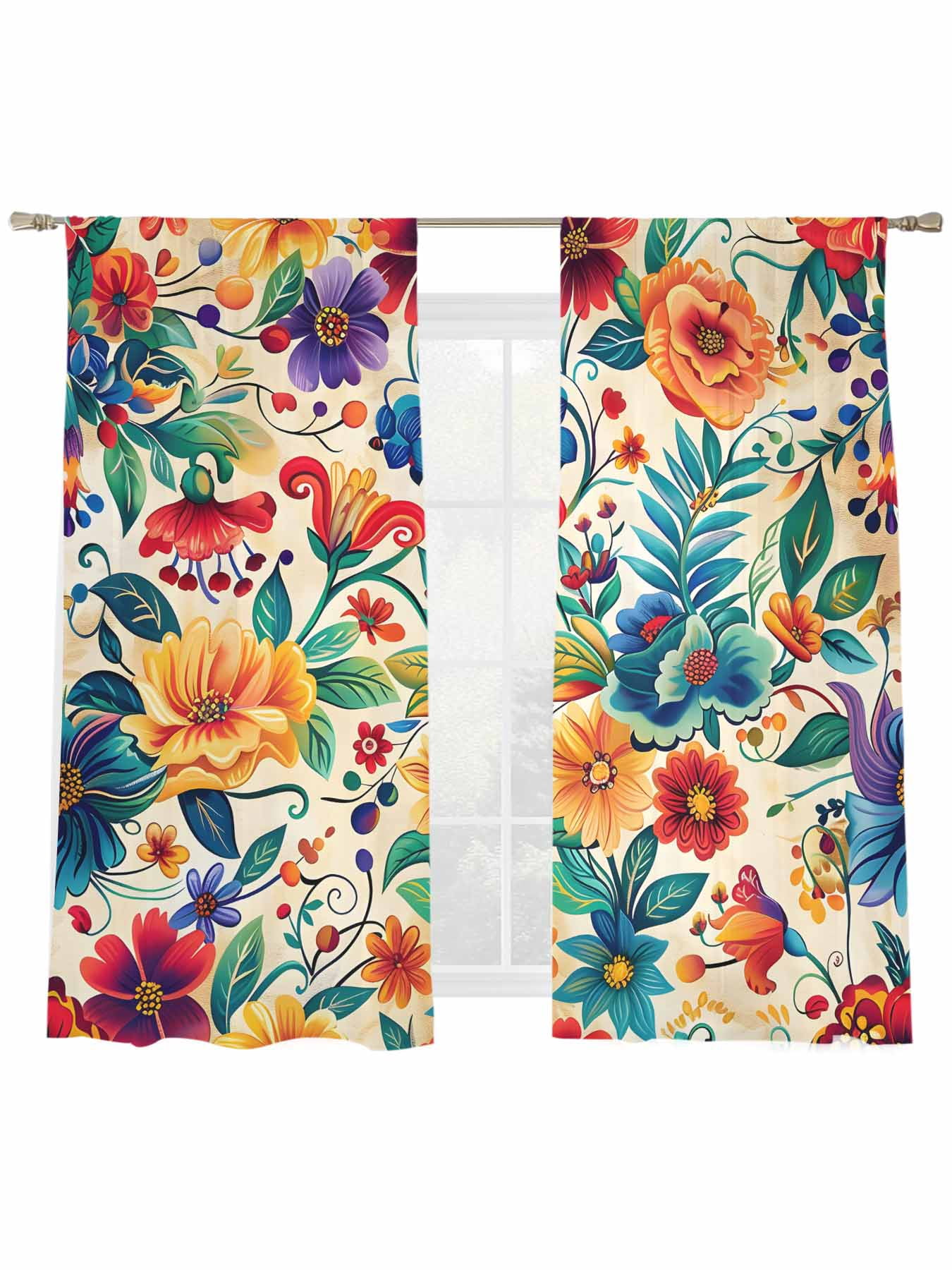 Boho Retro Window Sheer Curtain Spring Colorful Flowers Leaves Semi ...