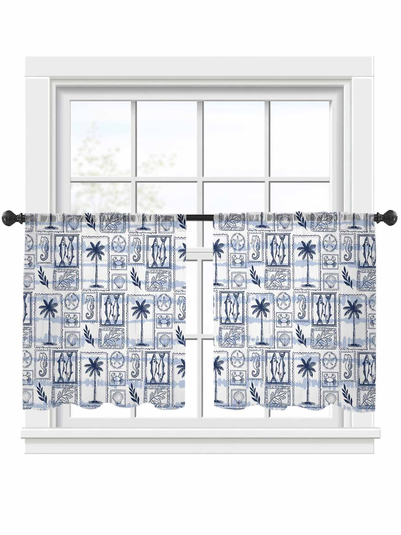 Coconut Tree Window Sheer Curtain Summer Shell Fish Sea Star Plaid Blue ...