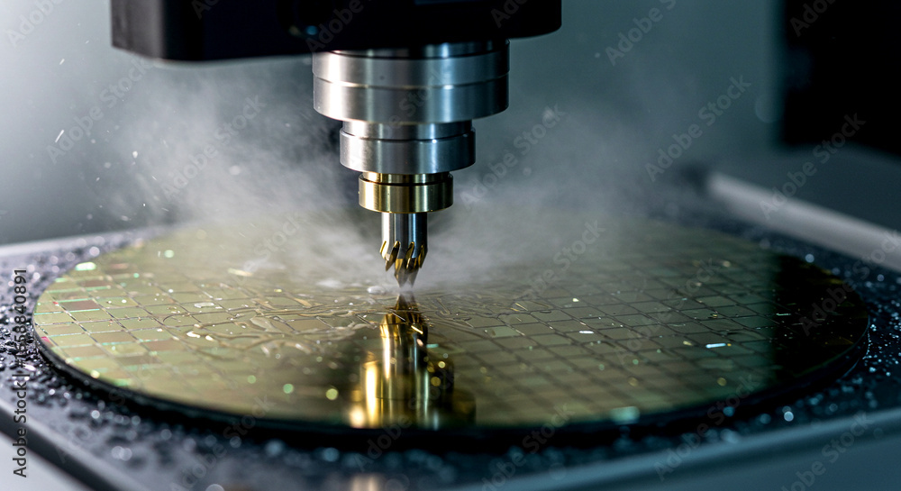 CNC Machine Milling Silicon Wafer with Coolant Mist and Grid Pattern ...