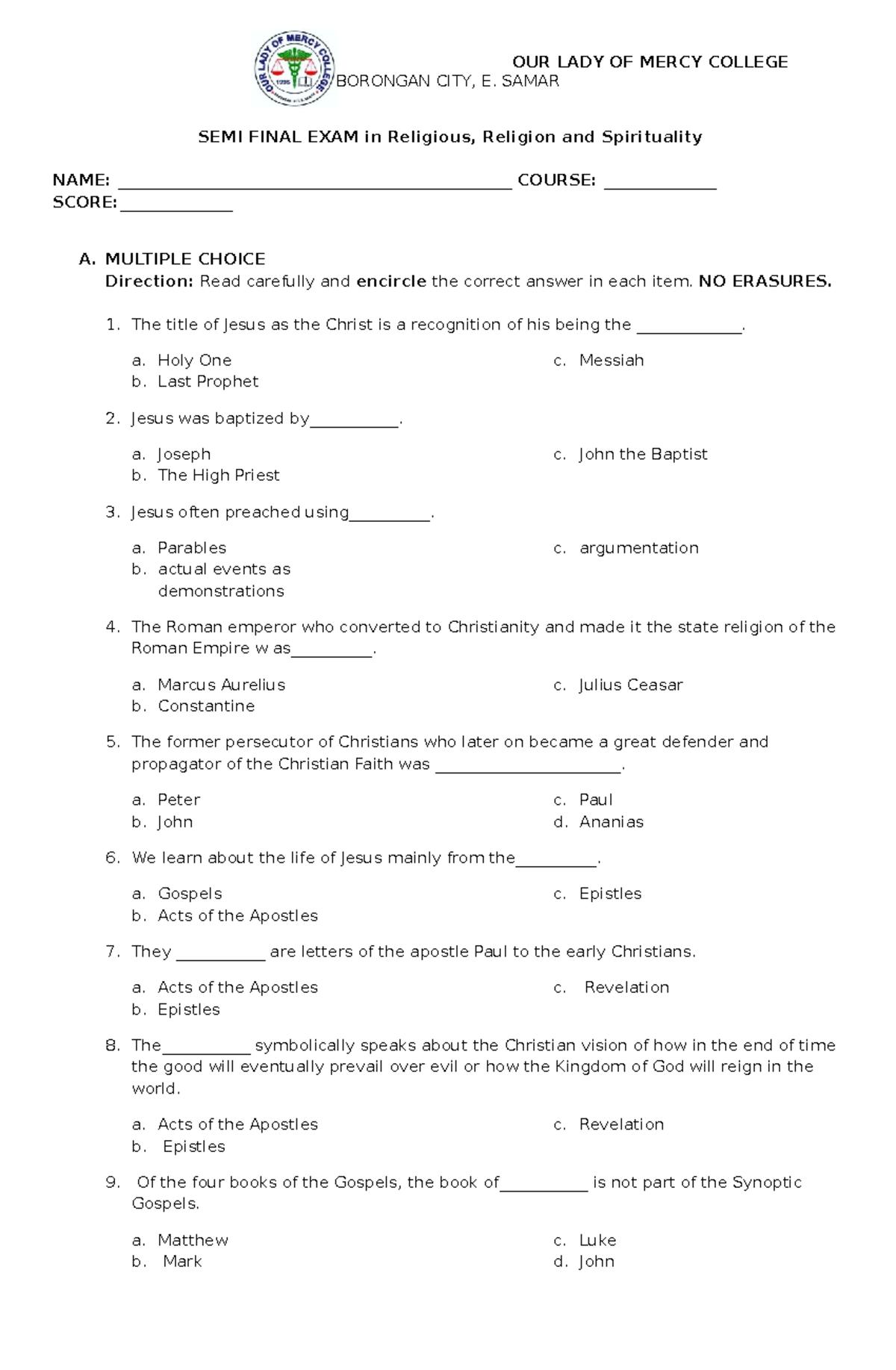SEMI Finals IN Religious - OUR LADY OF MERCY COLLEGE BORONGAN CITY, E ...