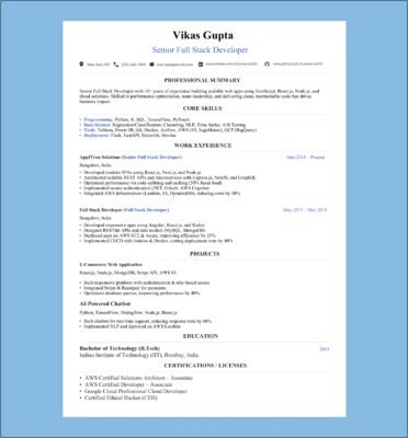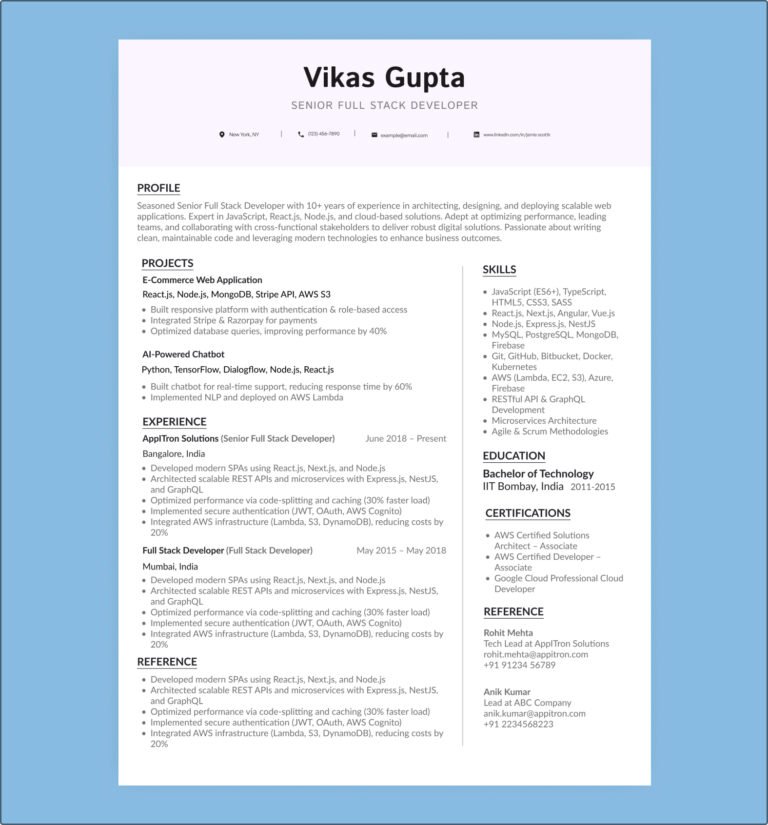 Senior Full Stack Developer Resume Example for Professionals