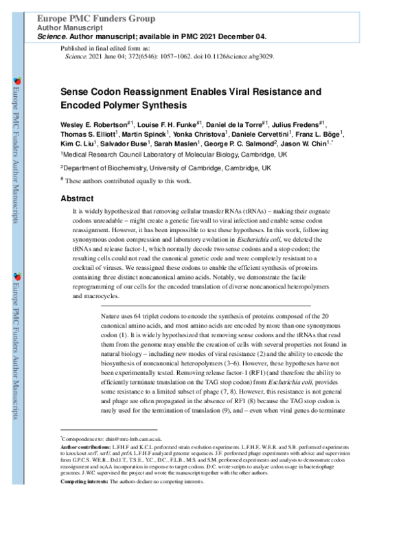 (PDF) Sense codon reassignment enables viral resistance and encoded ...