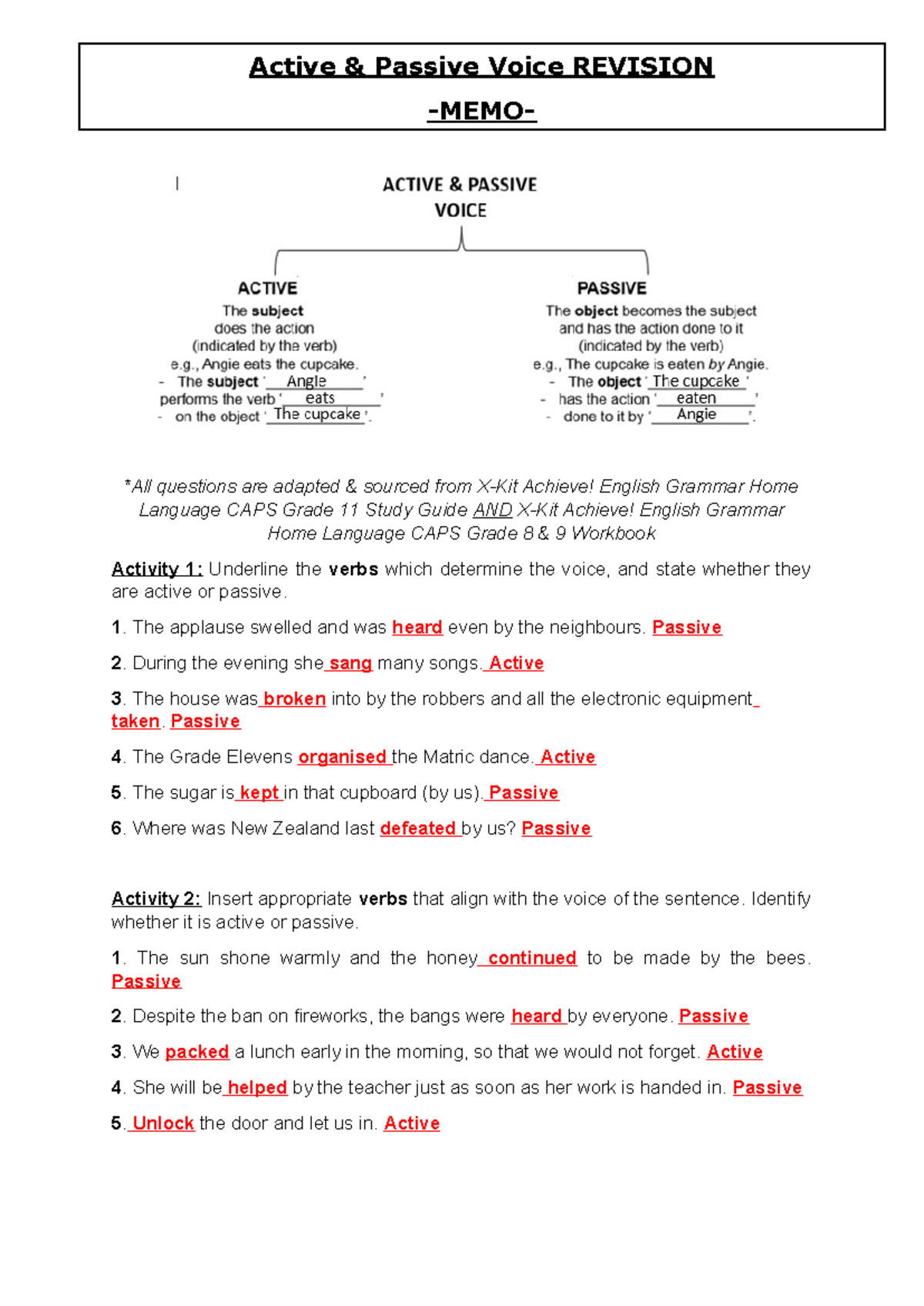 MEMO: Active & Passive Voice Revision Worksheet (Grade 11) - Studocu