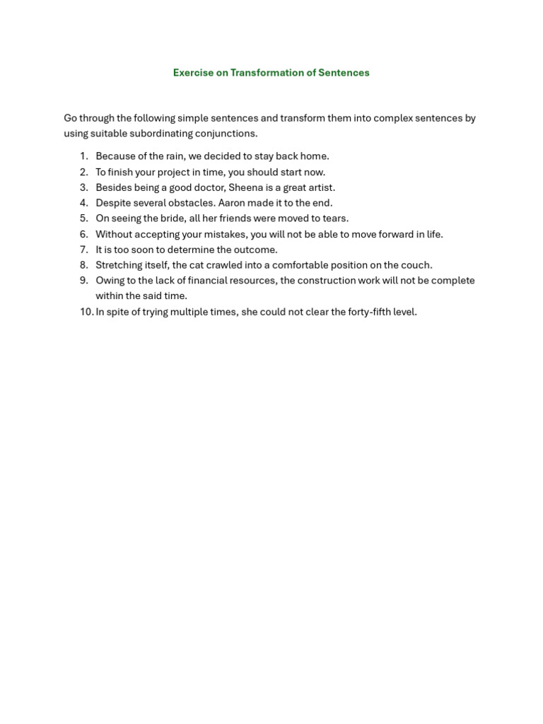 Simple, Compound and Complex Sentences Transformation Exercises