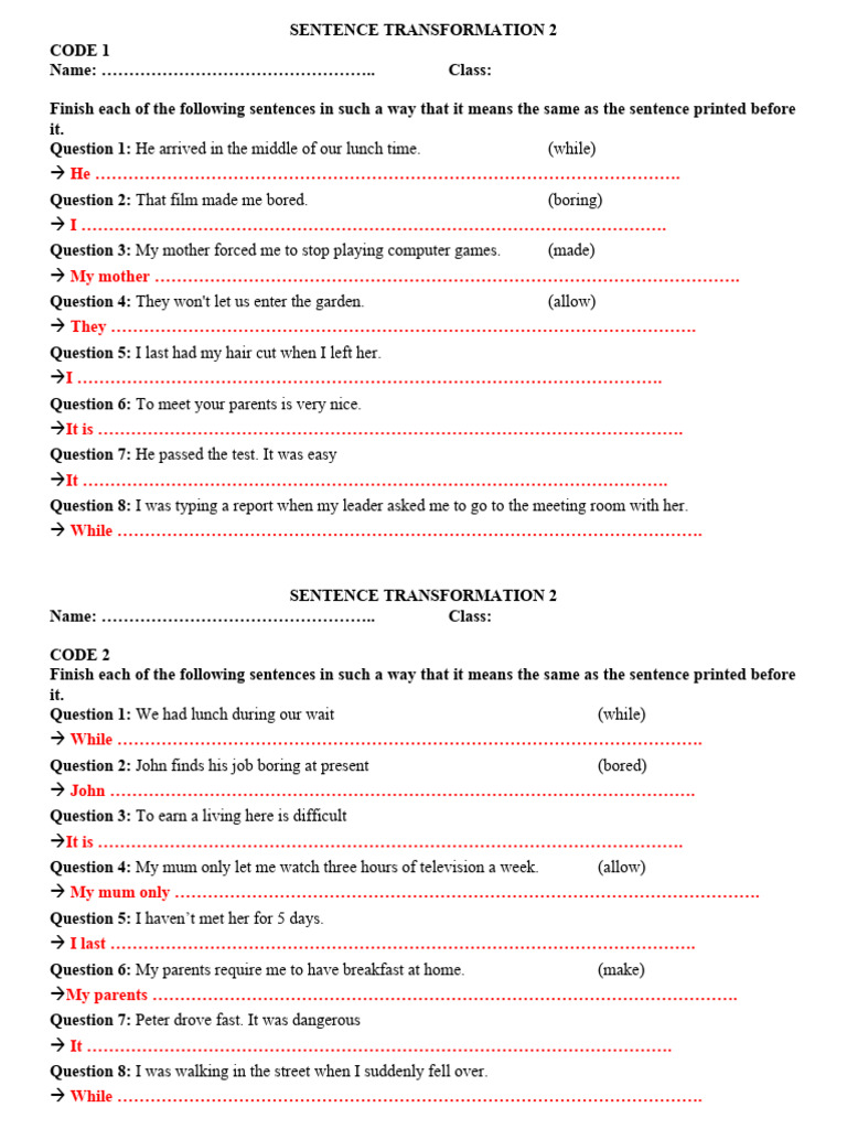 Sentence Transformation 2 Students | PDF