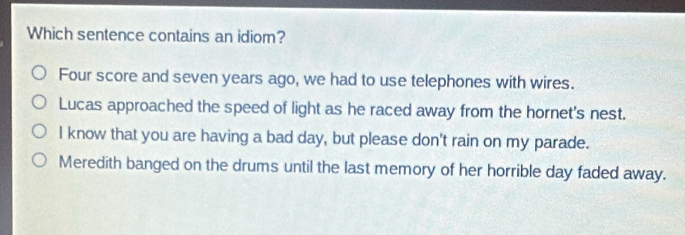 Solved: Which sentence contains an idiom? Four score and seven years ...