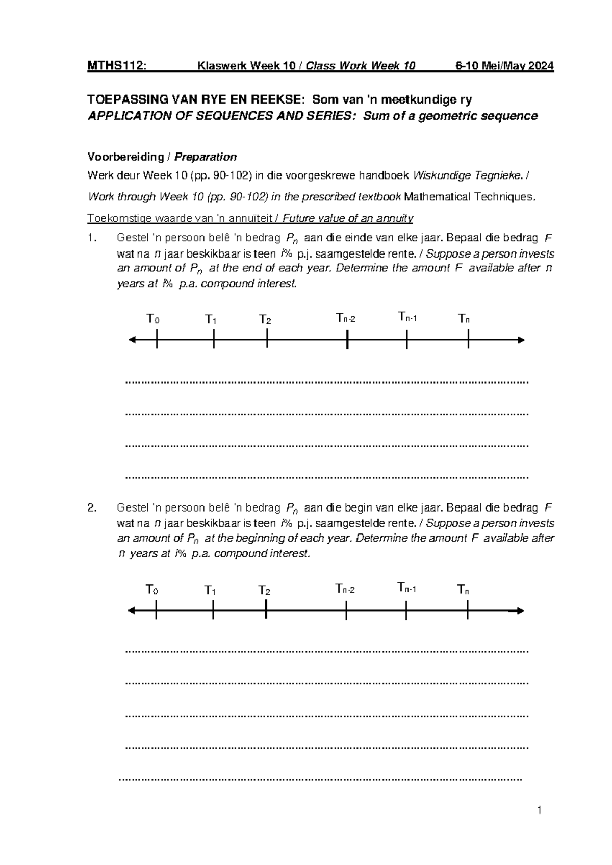 MTHS112 Class Work Week 10: Sequences & Series Applications - Studocu