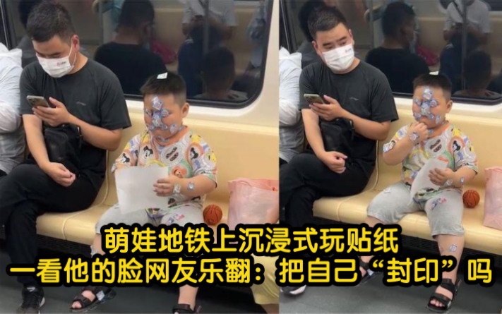 Cute kid gets fully immersed in sticking stickers on the subway; one ...