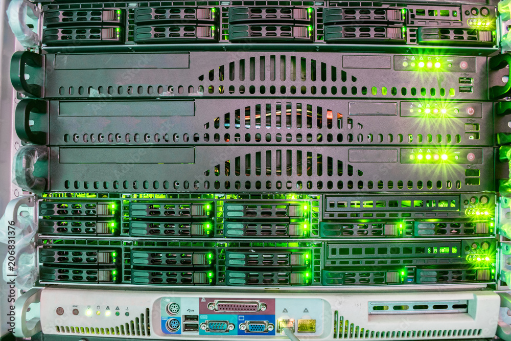 Computer servers are in the rack of a modern data center. Database of ...