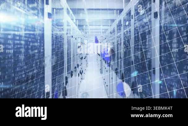 Animation of data processing against empty computer server room ...