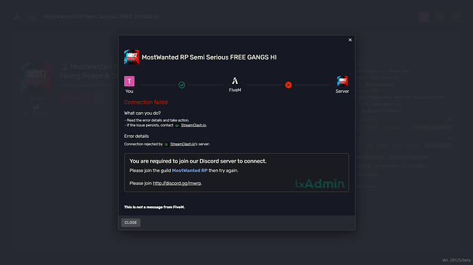 fiveM isnt allowing me to hop into a server and is failing instantly ...