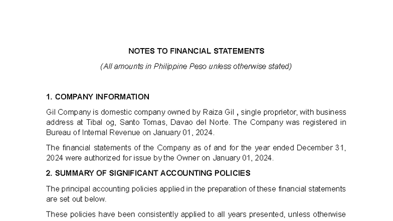 NOTES TO FINANCIAL STATEMENTS (PFRS for SEs) - Gil Company 2024 - Studocu