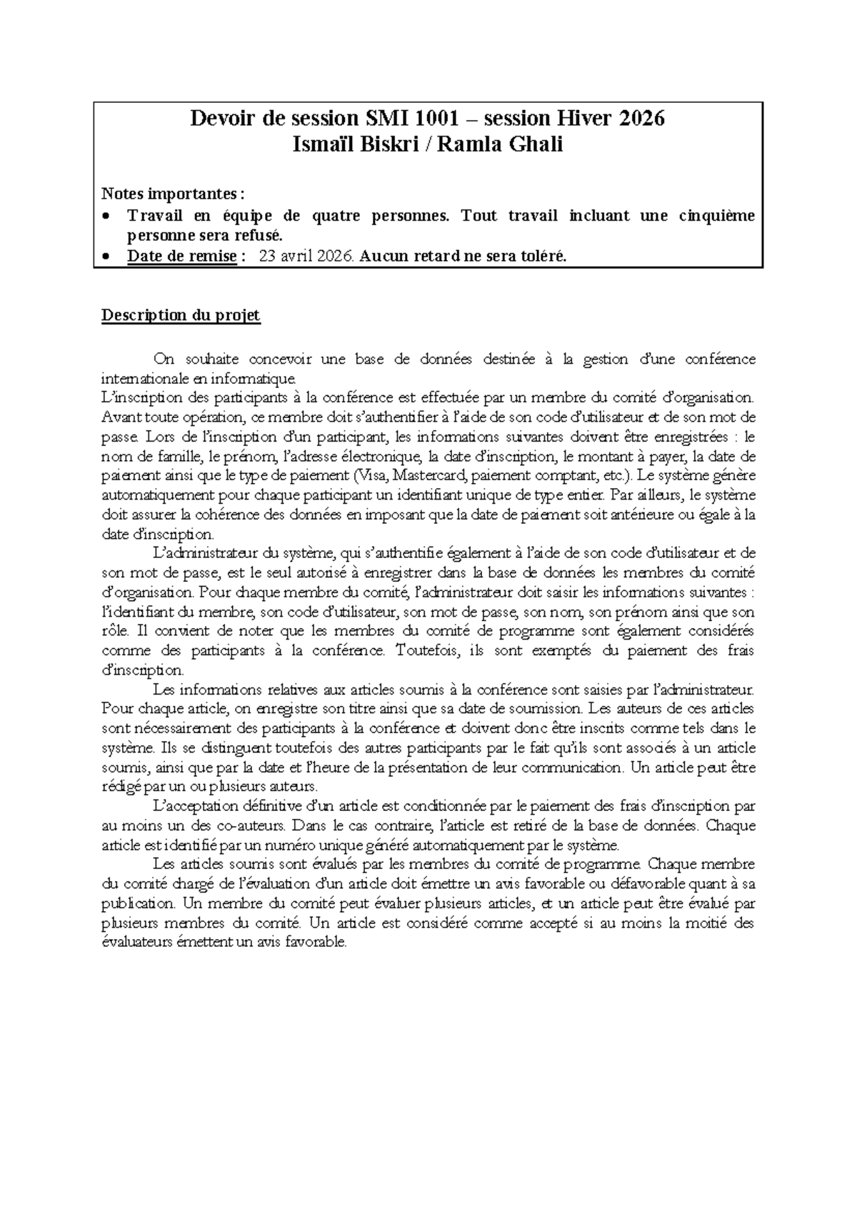 Devoir de session SMI 1001 Hiver 2026 : Gestion de Conférence - Studocu