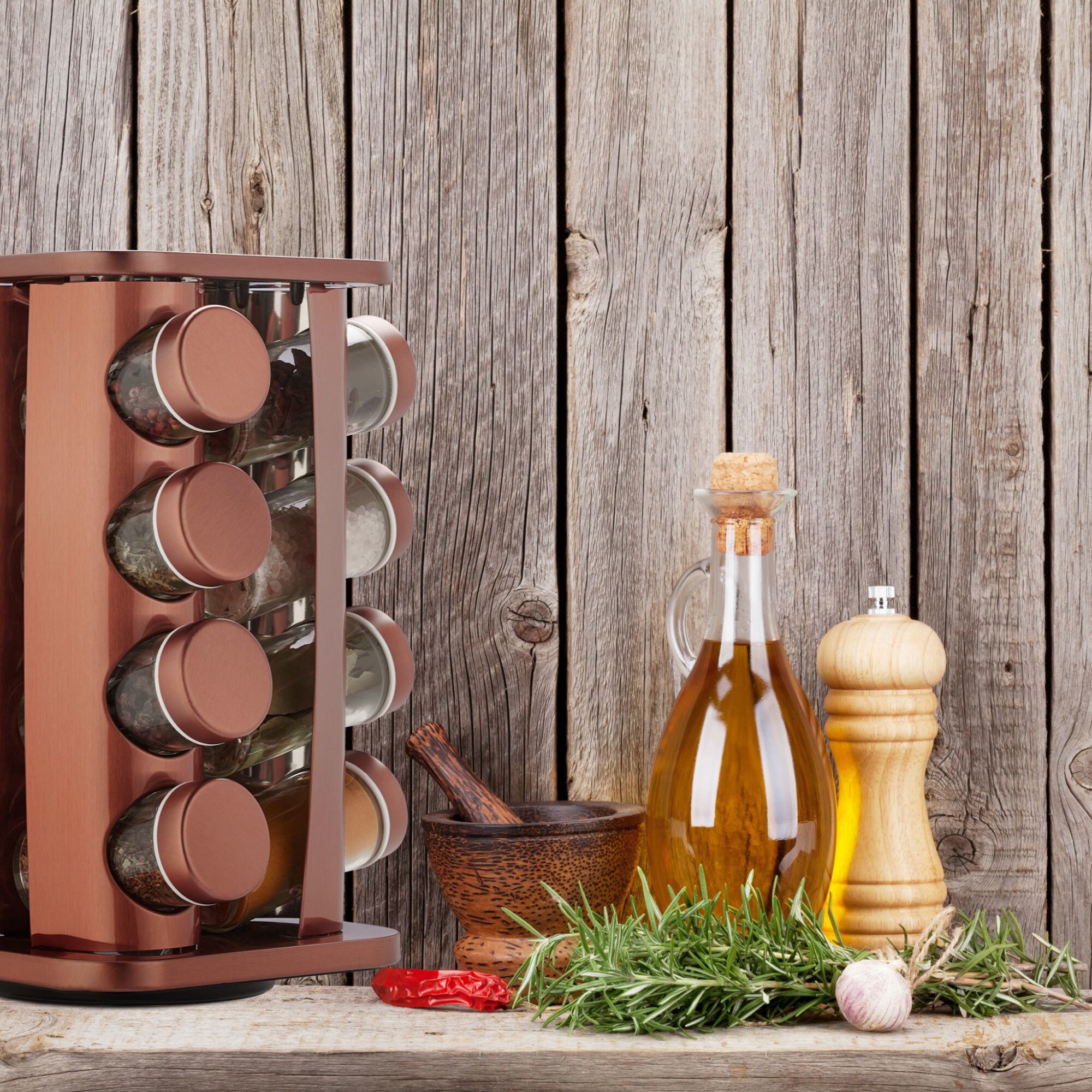Set 16 recipiente condimente cu suport rotativ, inox, bronz, 28 x 20 x ...