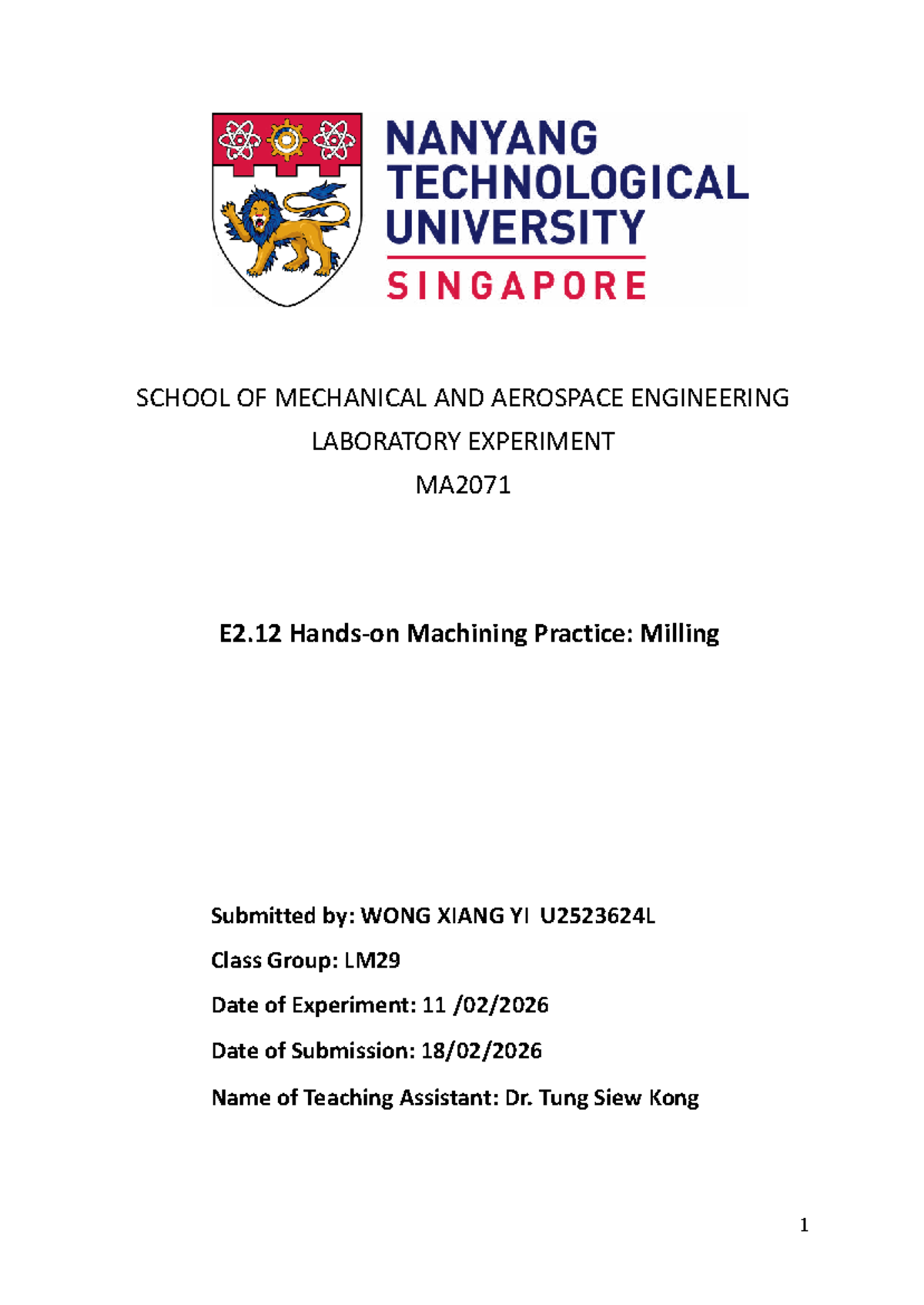 MA2071 Lab Report: Milling Machine Operations and Practices - Studocu