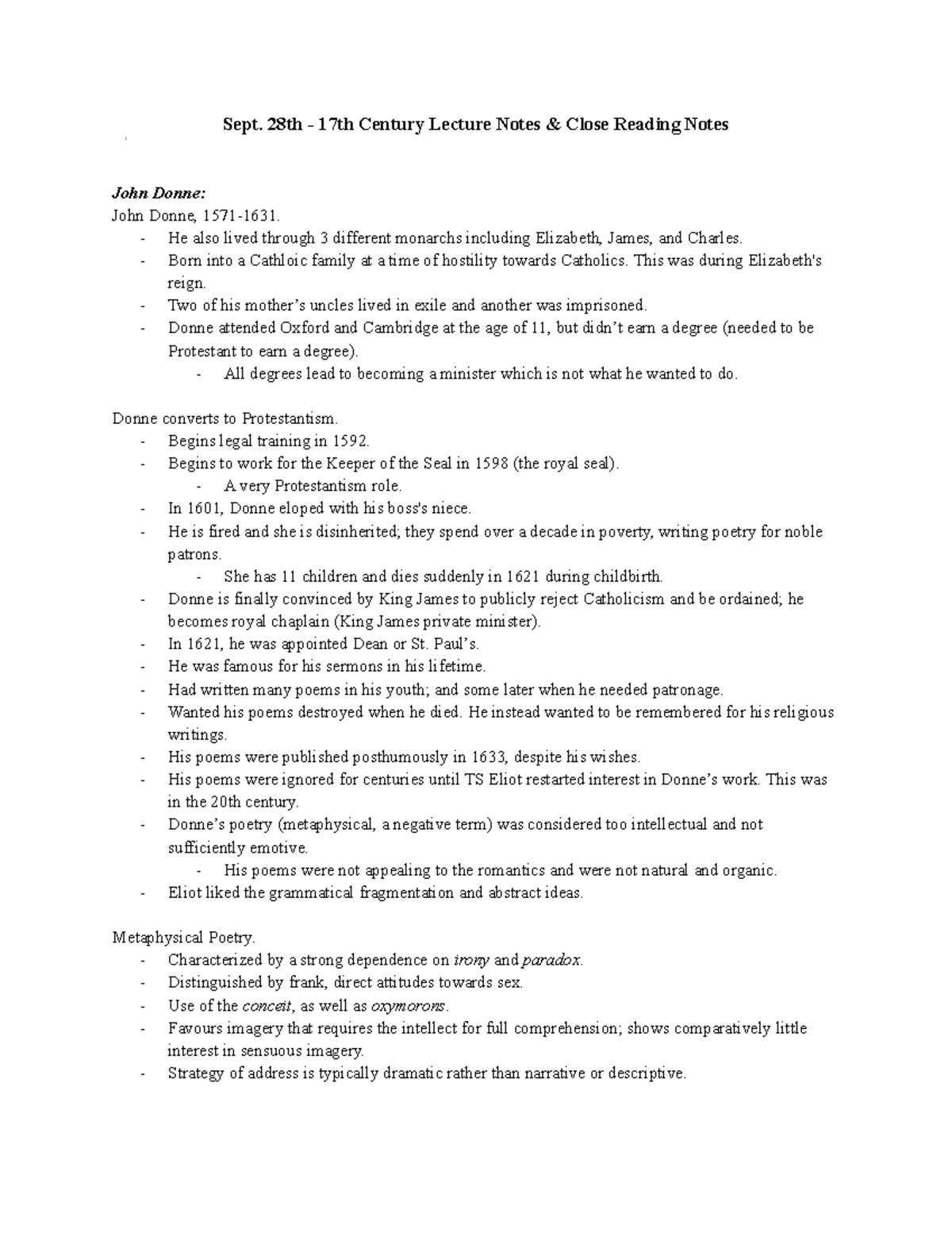 Sept. 28th - 17th Century Lecture Notes and Close Reading Notes - Sept ...