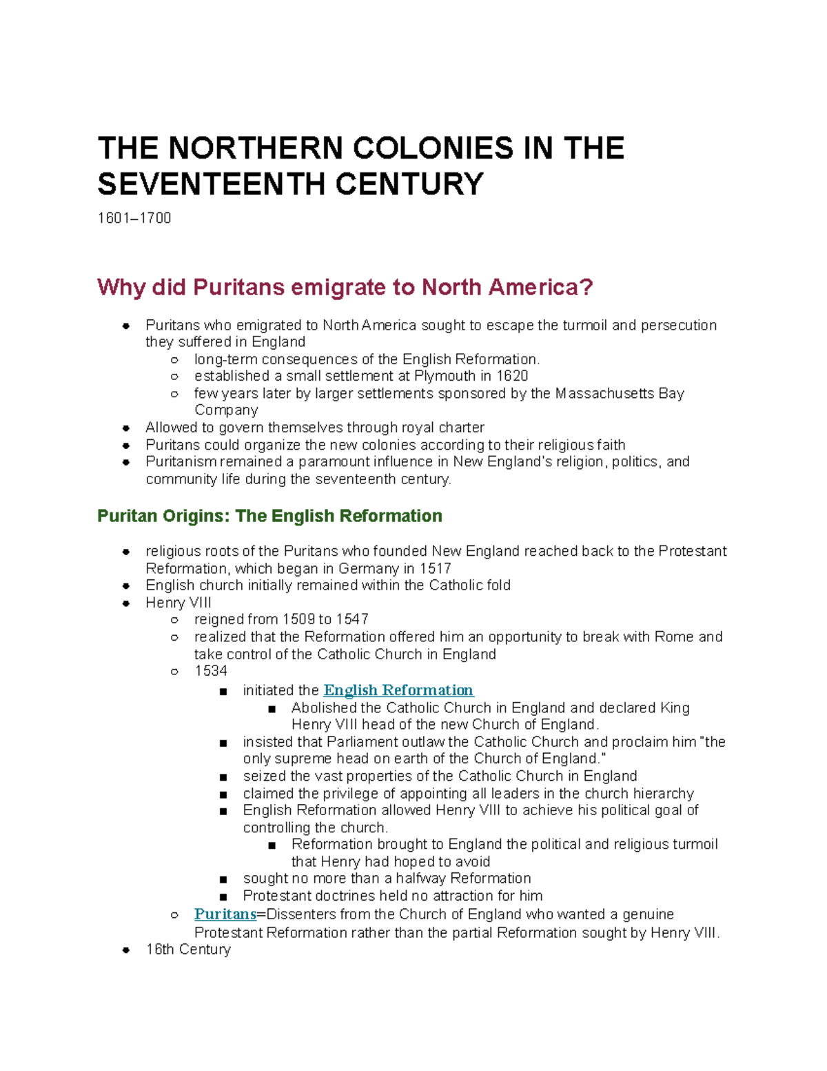 USHx Ch 4 Notes - THE NORTHERN COLONIES IN THE SEVENTEENTH CENTURY 1601 ...