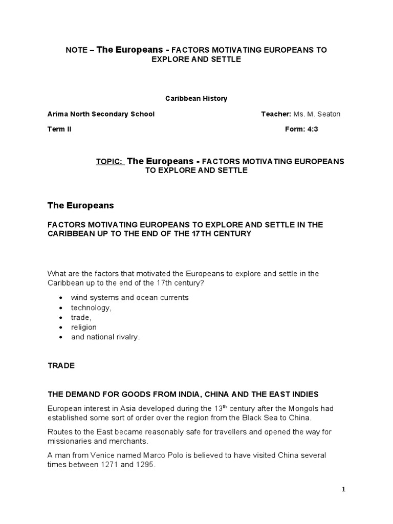 Note - Factors Motivating Europeans To Explore and Settle in The ...