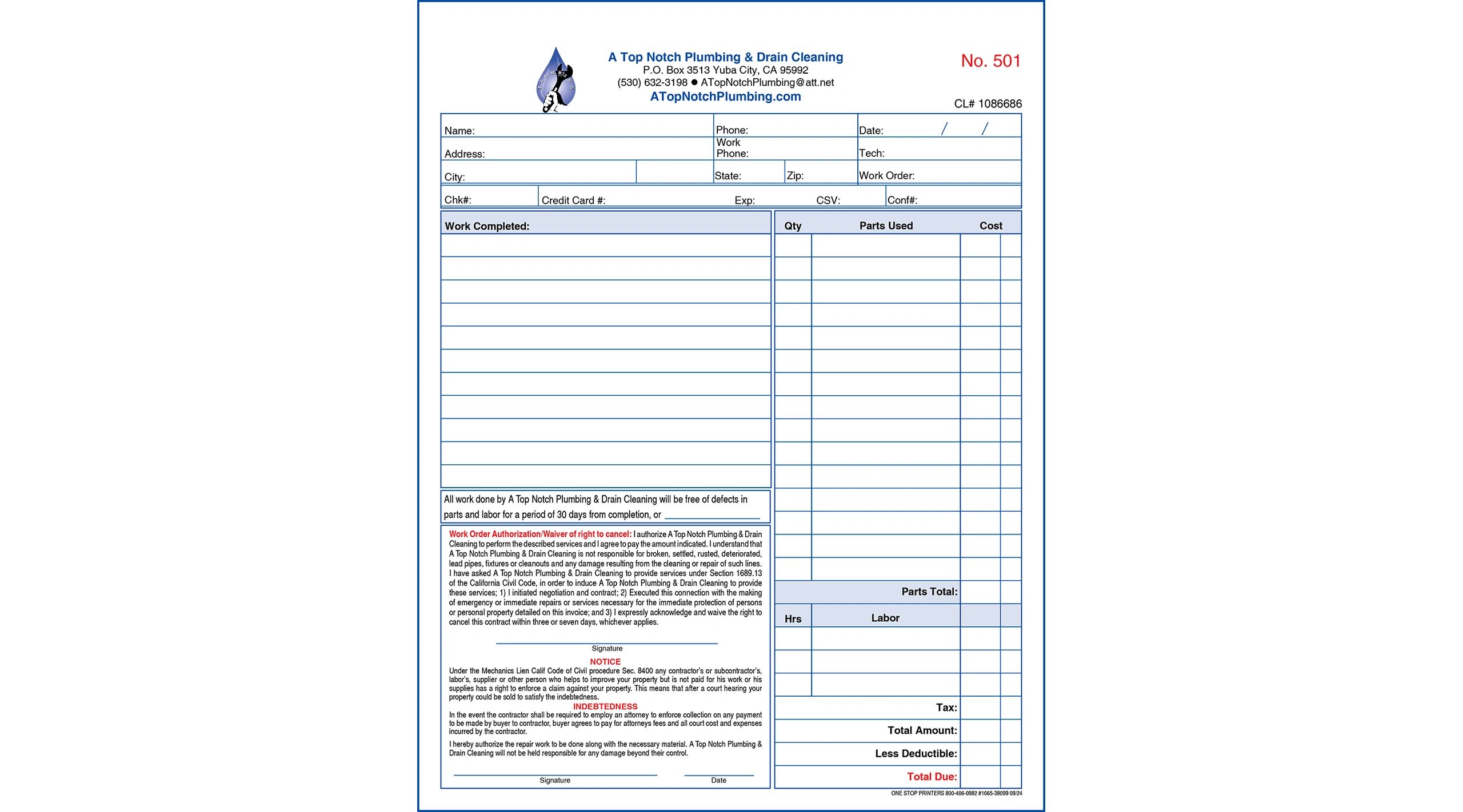 Plumbing Receipt/Invoice/Work Order