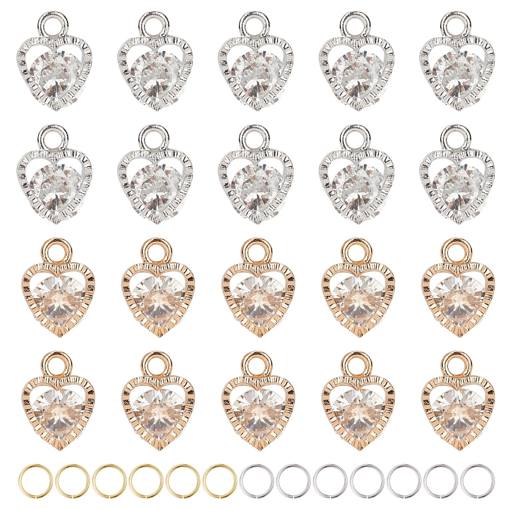 Alloy Charms with Clear Cubic Zirconia and Brass Jump Rings Heart Shape ...