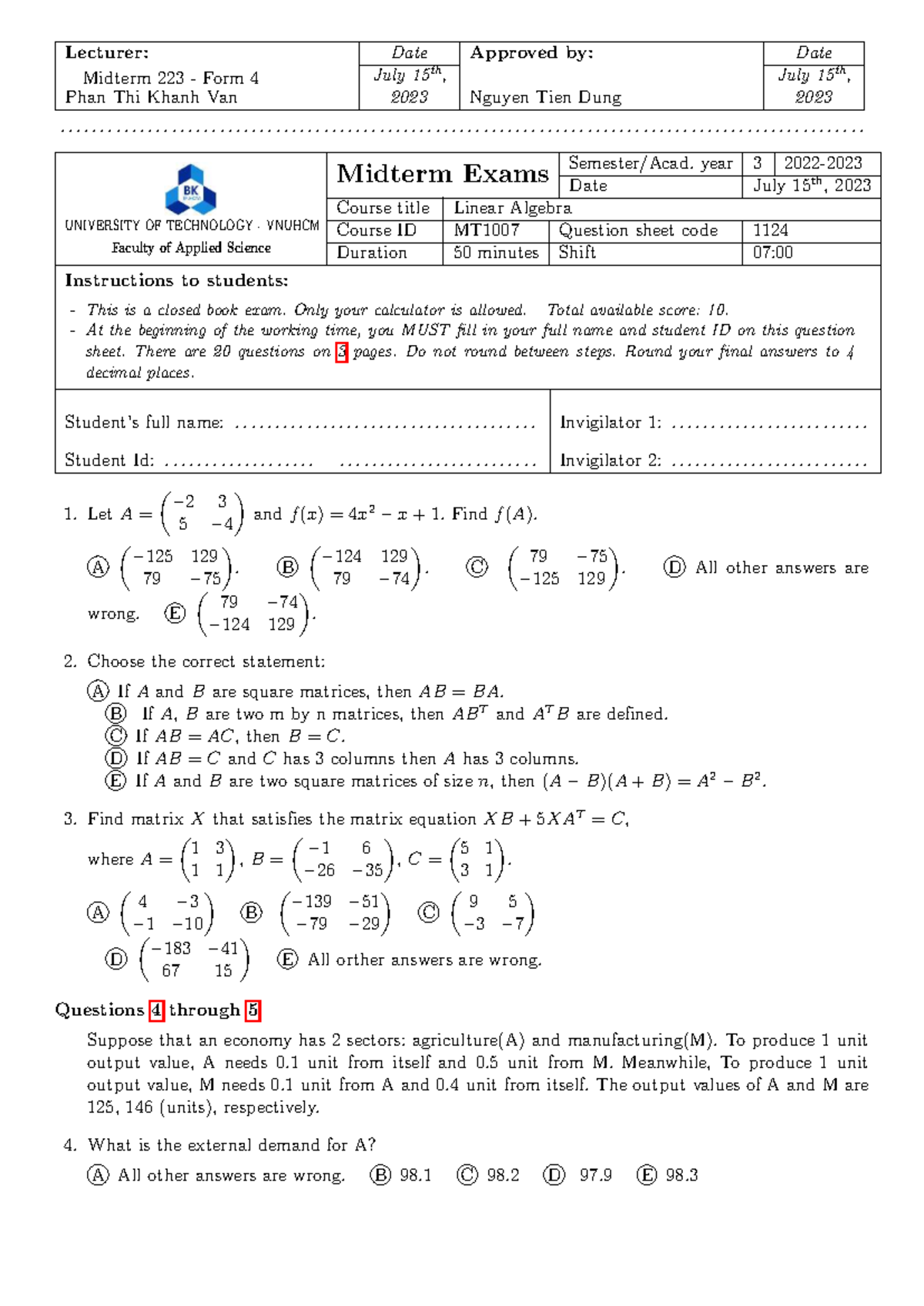 Linear Algebra MT1007 Midterm Exam Practice Questions - Studocu