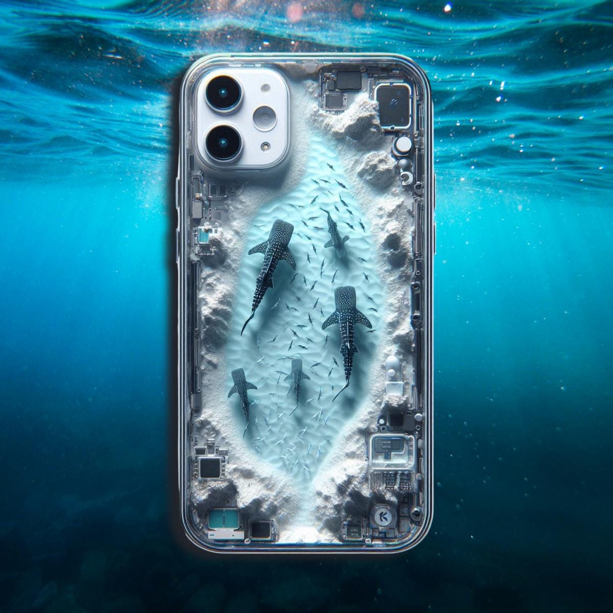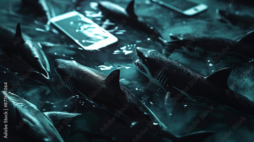 Smartphones float amidst sharks in the water conveying the perils and ...