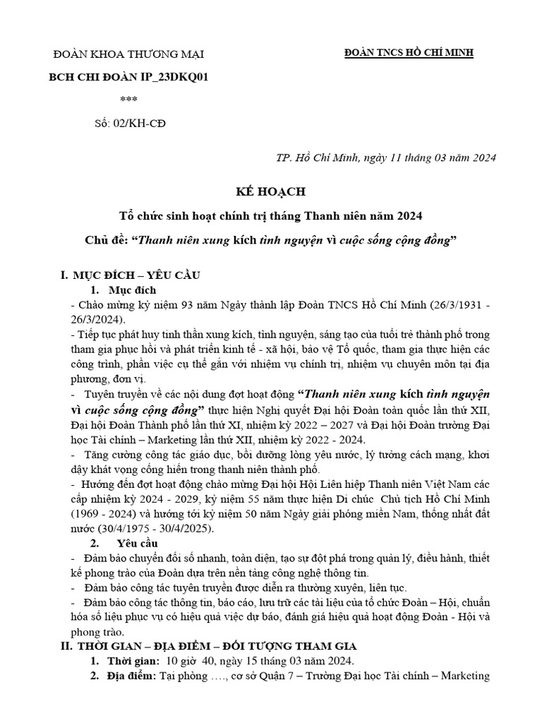 Kế Hoạch SHCT Tháng Thanh Niên - IP - 23DKQ01 | PDF