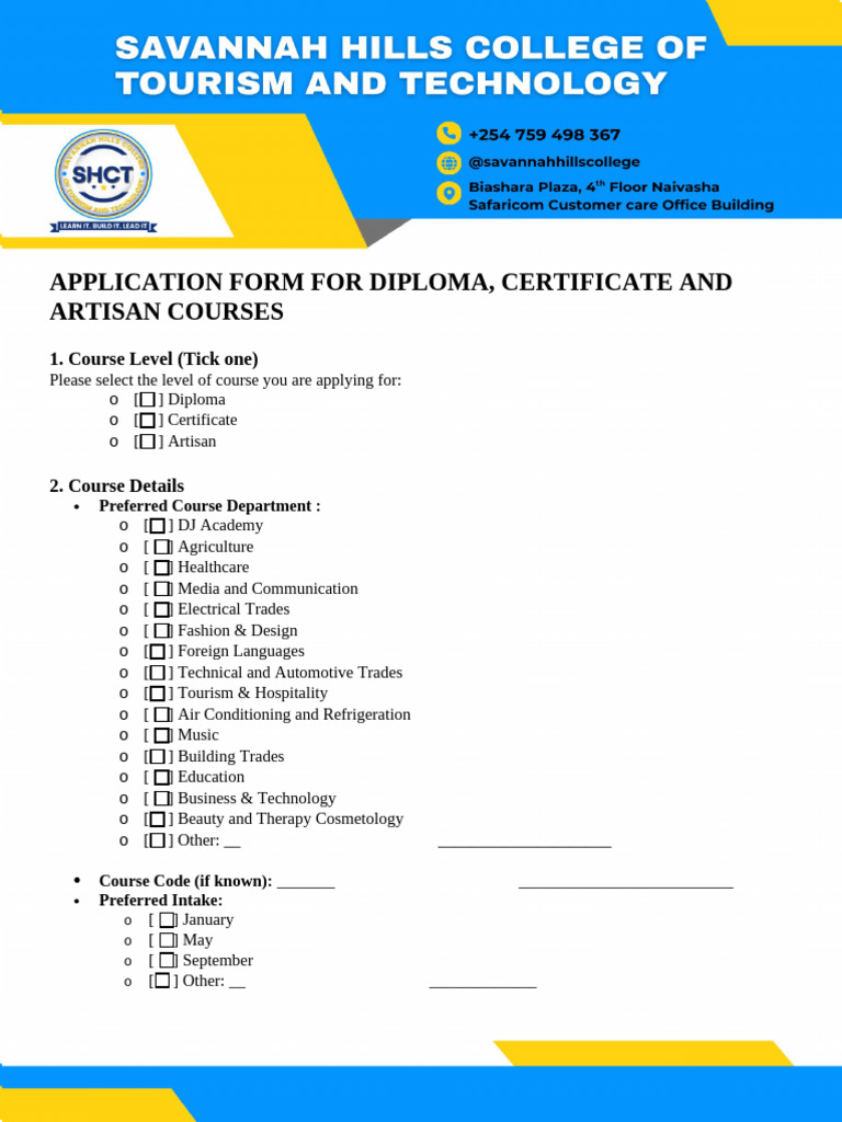 SAVANNAH HILLS COLLEGE OF TOURISM AND TECHNOLOGY (SHCT) Aplication Form ...