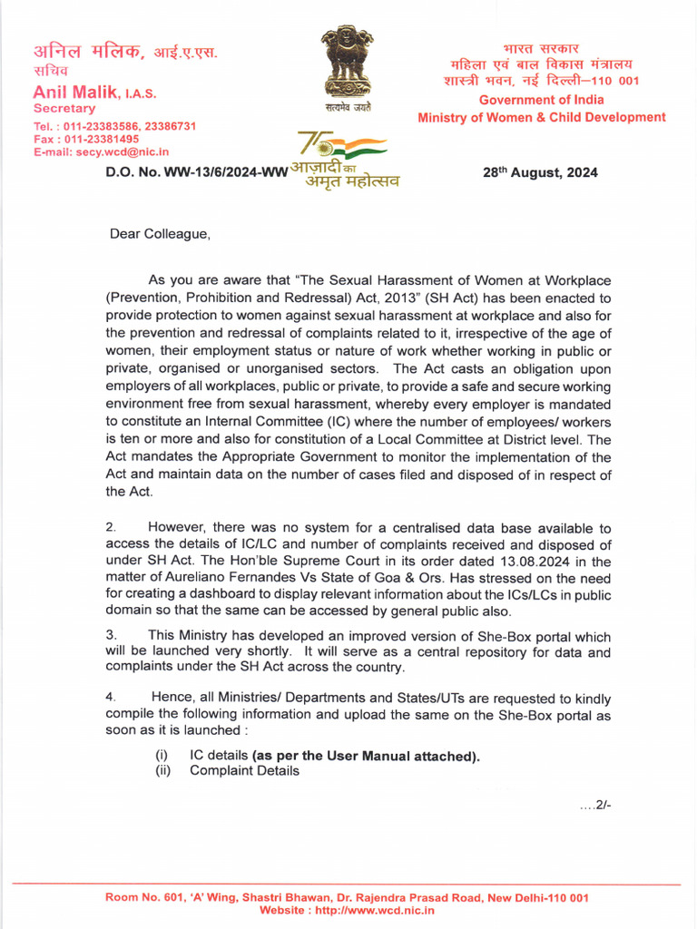SHe-Box portal works as per provisions of Sexual Harassment of Women at ...