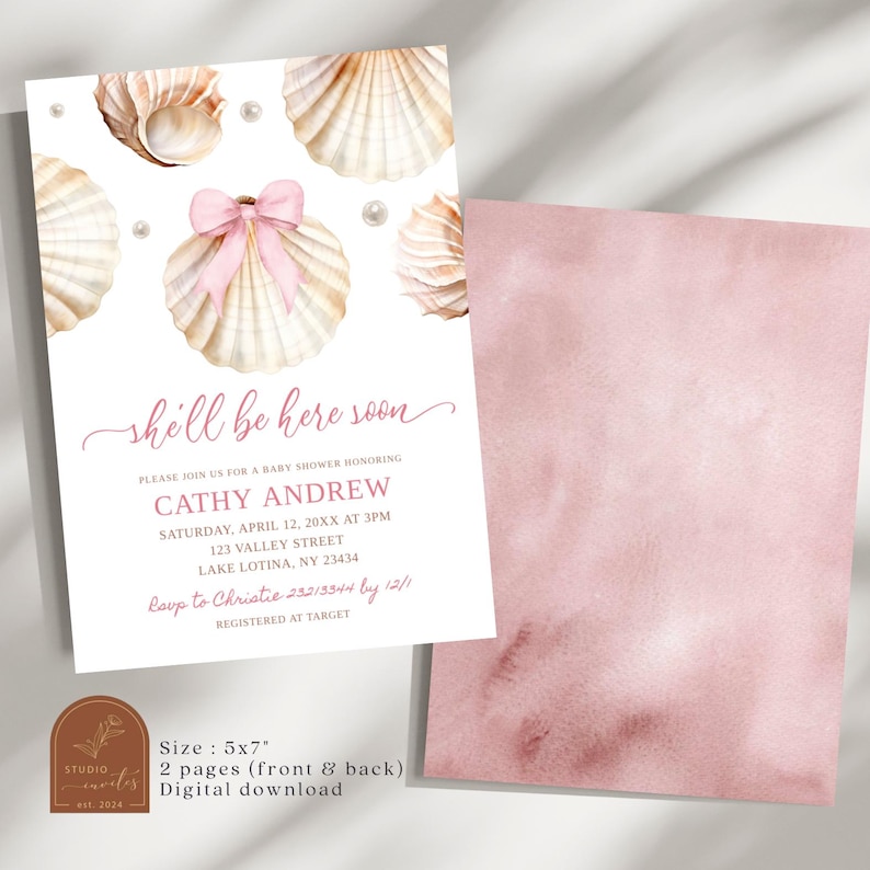 She'll Be Here Soon Sea Shell Baby Shower Invitation, Pink Bow and ...