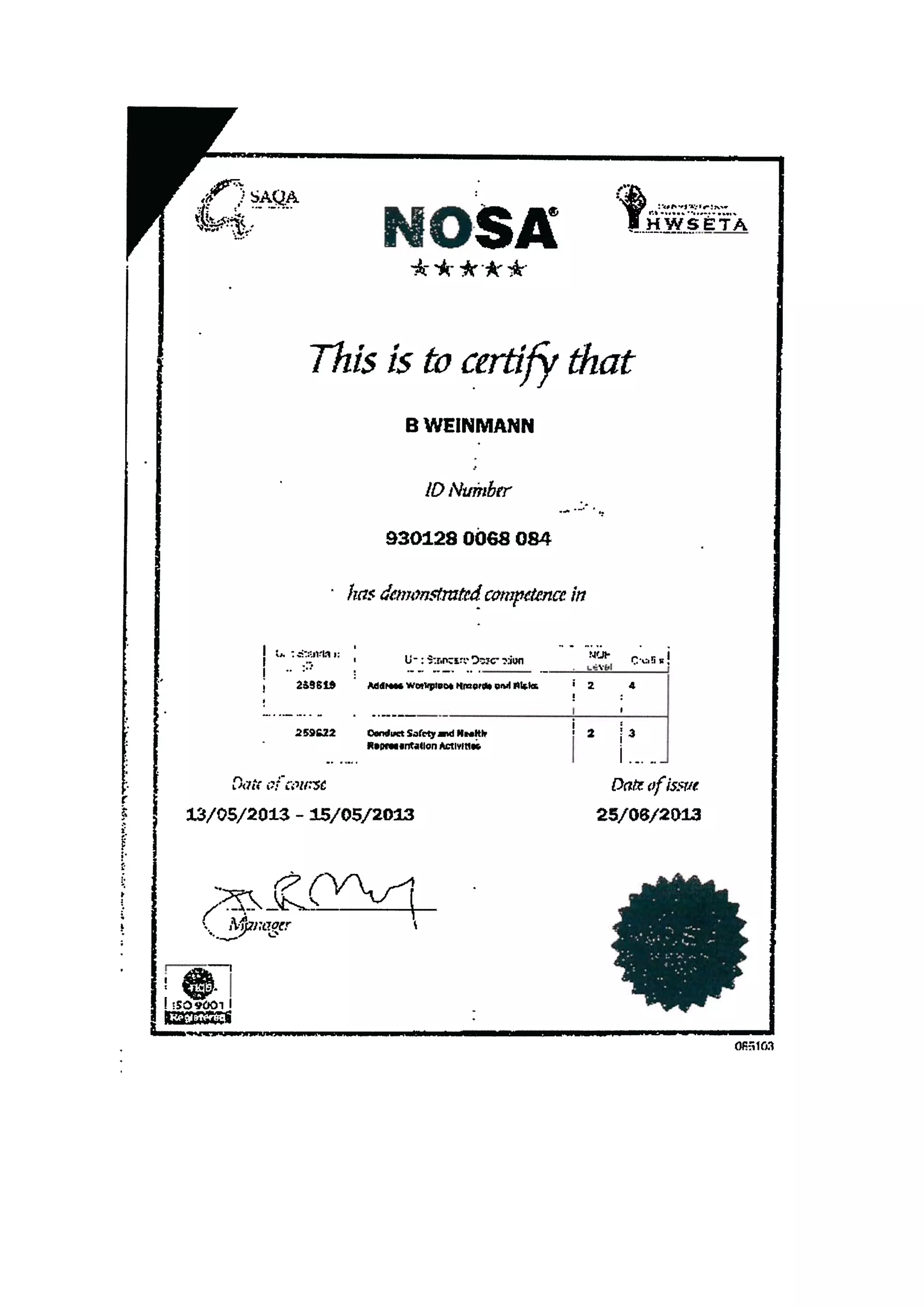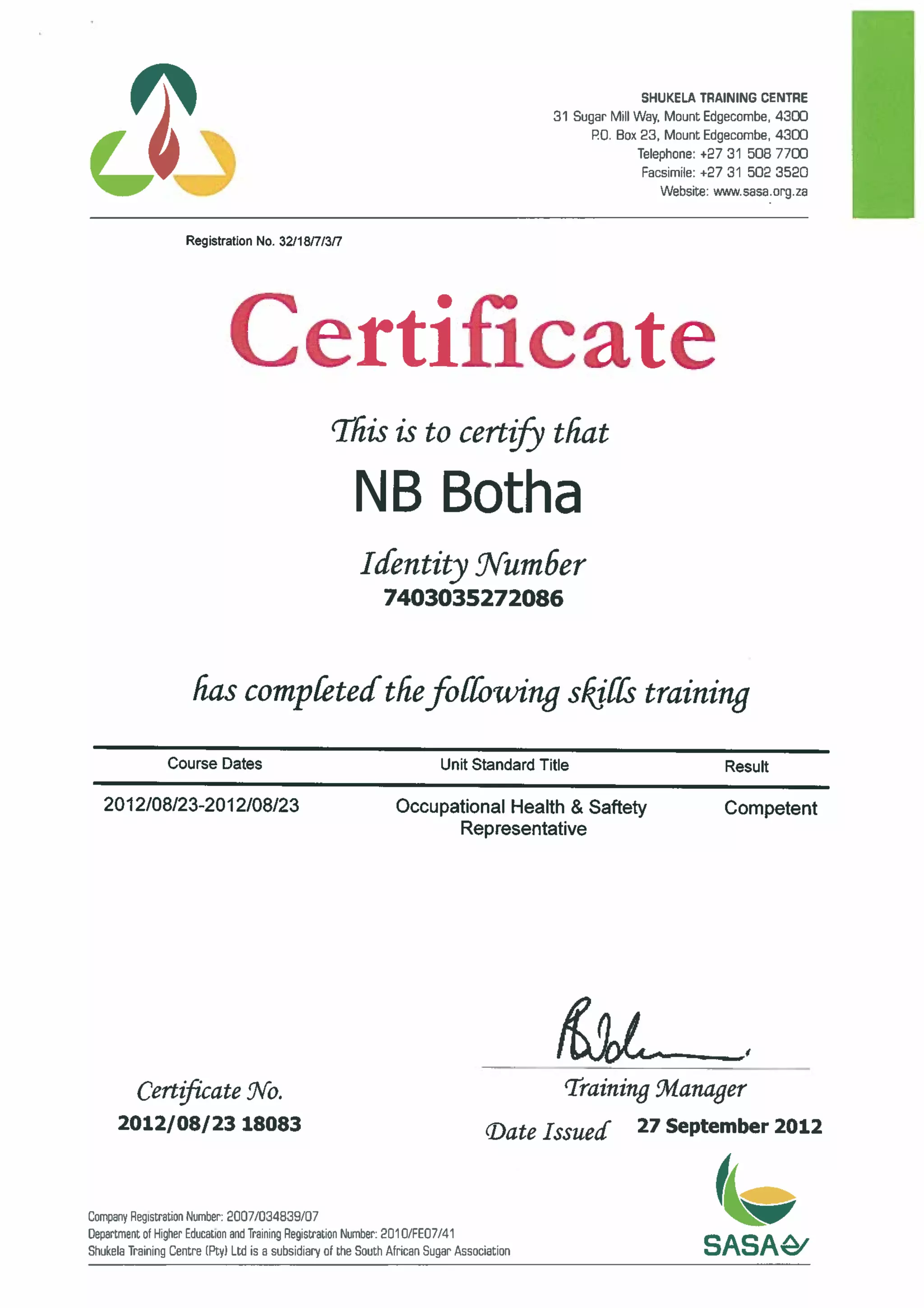 NOSA SHE REPRESENTATIVE CERTIFICATE | PDF