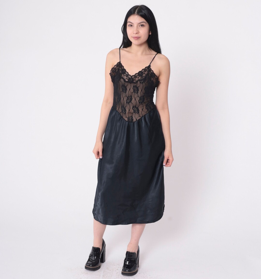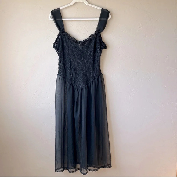 Sheer Black Nightgown 80s Lace Slip Dress Midi Basque Waist Low V Back ...