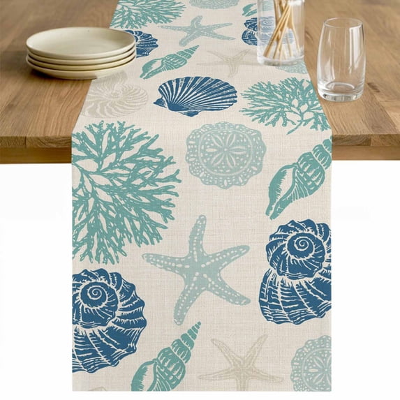 Blue Coastal Table Runner - 90 Inch Long Starfish Shell Coral Summer ...