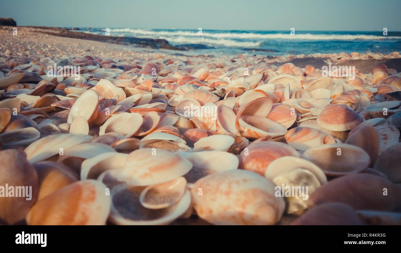 Sea Shells along the beach background Stock Photo - Alamy