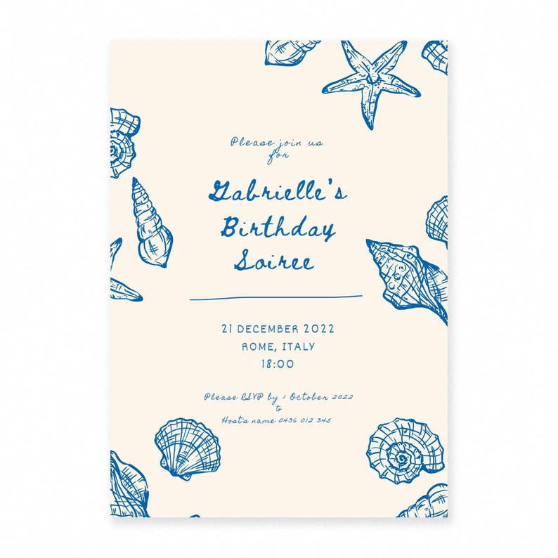 Hand Drawn Blue Illustrated Beach Shell Birthday Soiree Invite Template ...