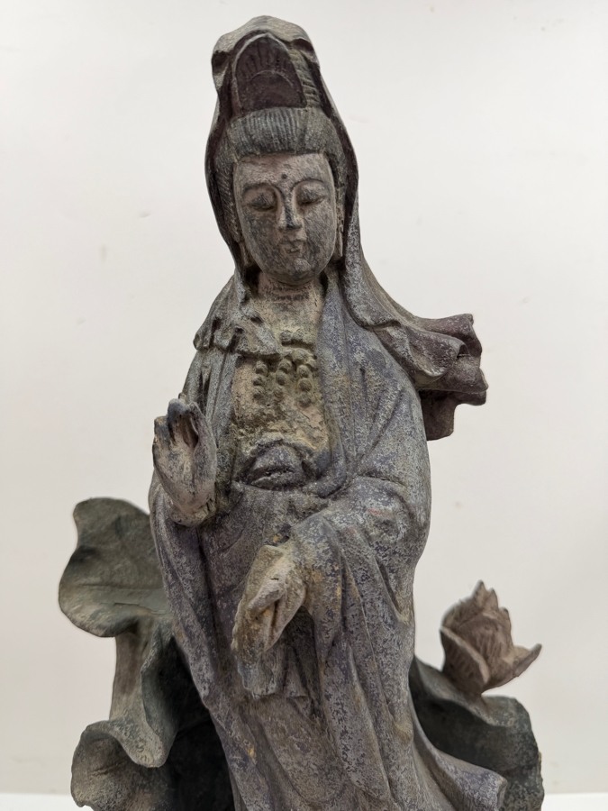 Vintage Chinese Carved Wooden Statue Of Guanyin 10.5W X 19H (RSF)