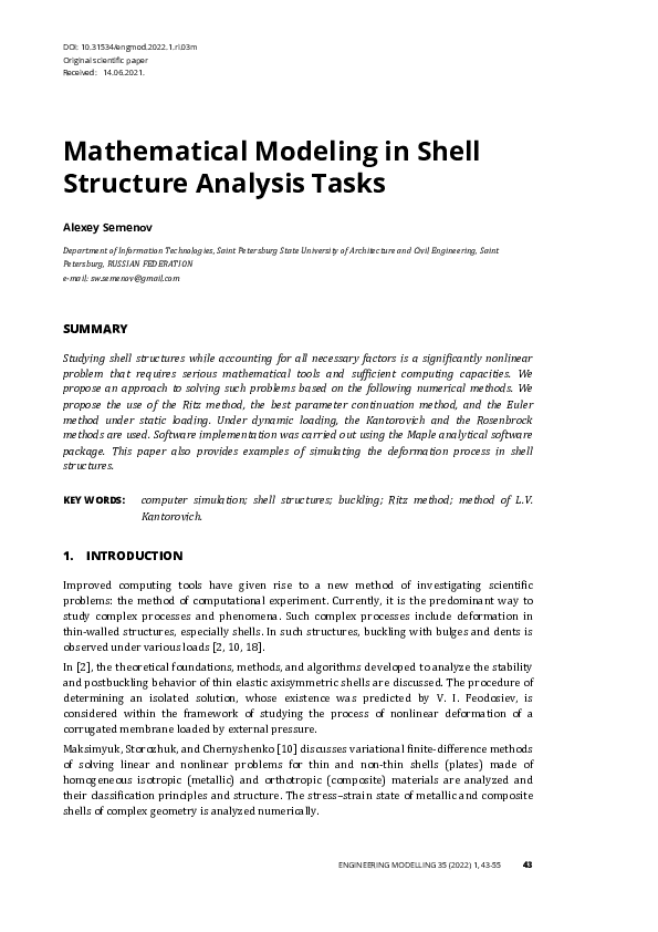 (PDF) Mathematical Modeling in Shell Structure Analysis Tasks