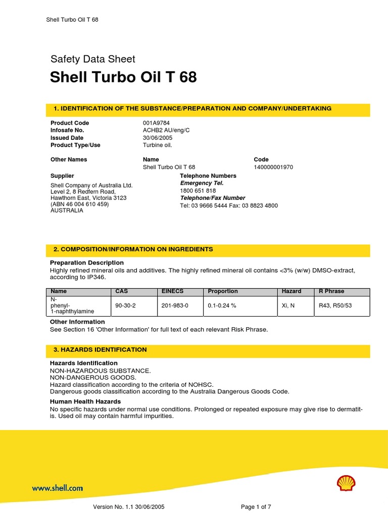 Shell Turbo Oil T 68 MSDS | PDF | Safety | Occupational Safety And Health