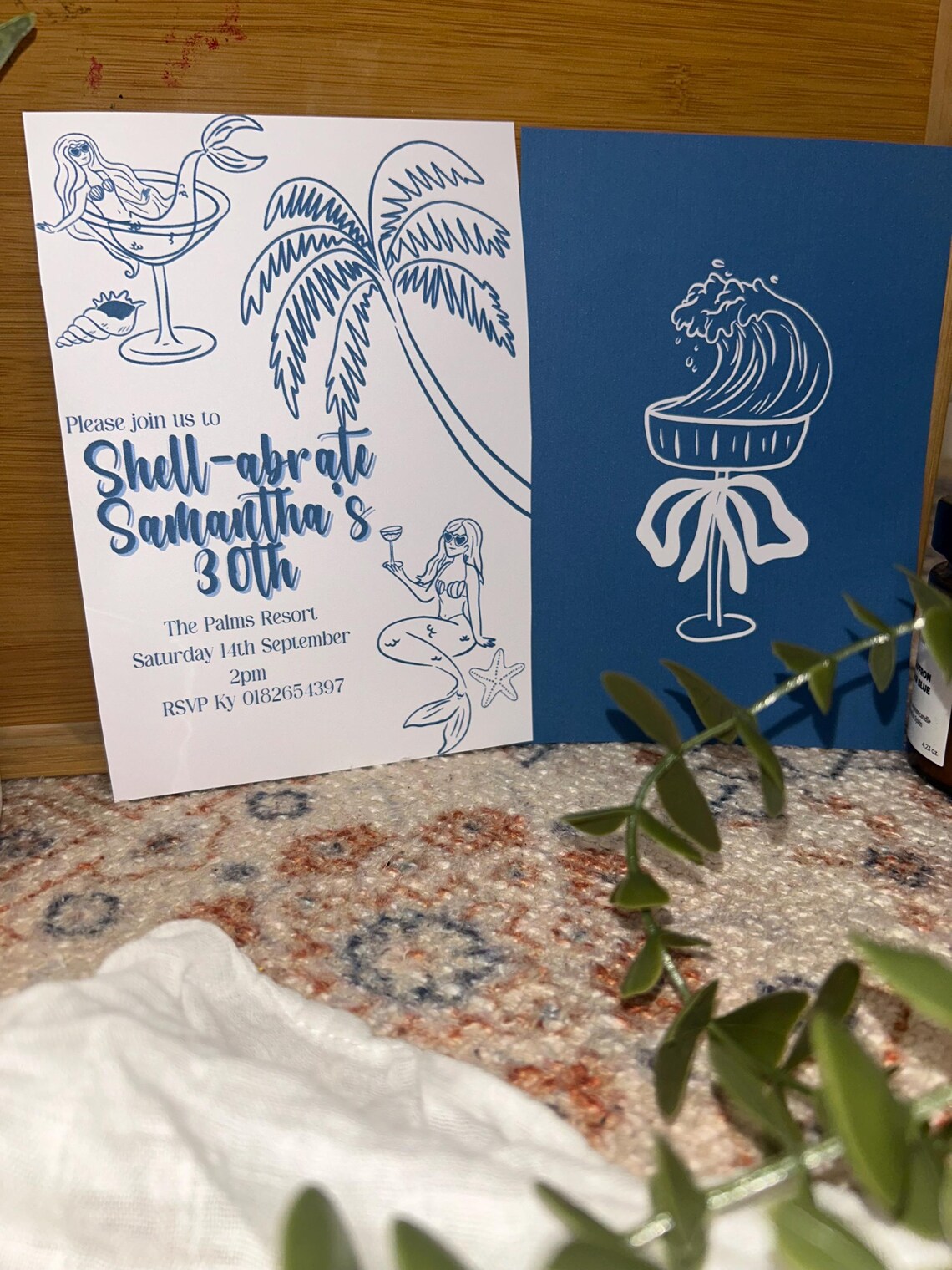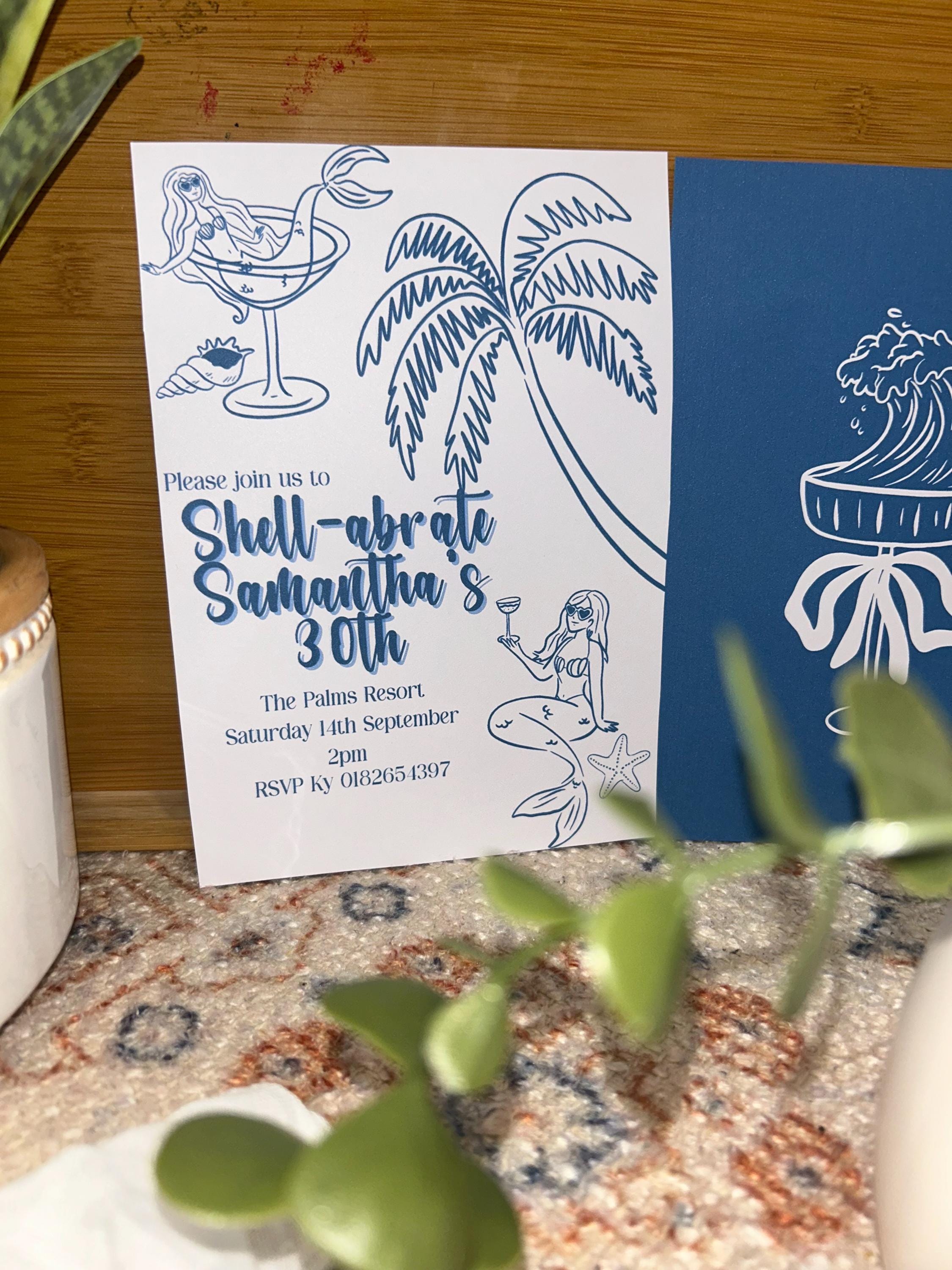 Hand Drawn Pale Blue Illustrated Beach Shell Birthday Soiree Invite ...