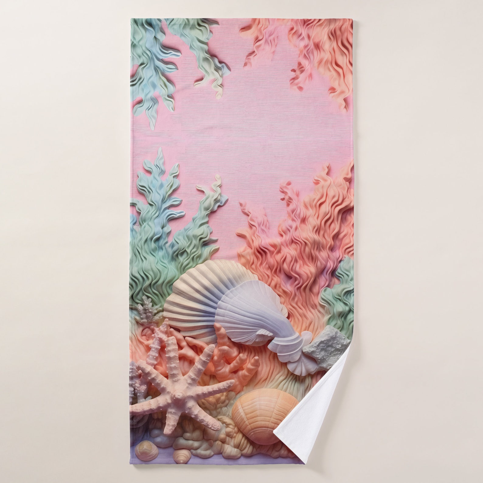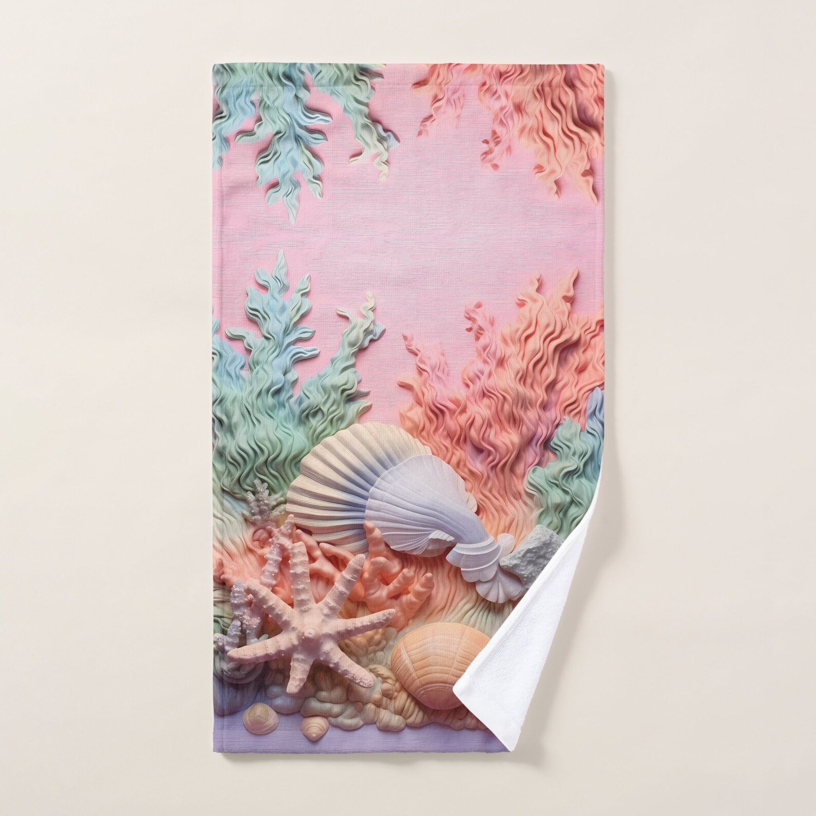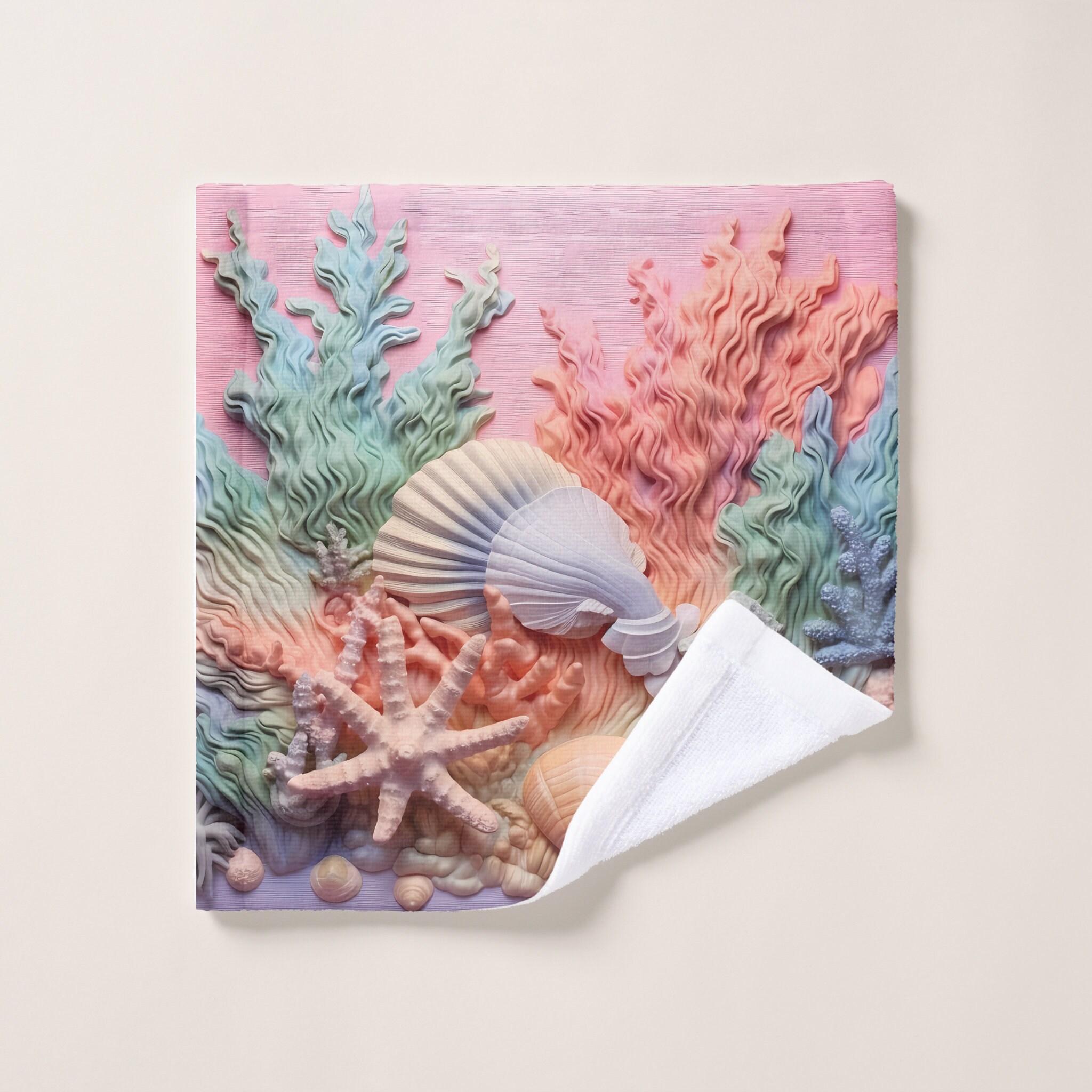 3pc Bath Towel Set, Coral, Seashells, Beach, Ocean, Polyester & Cotton ...