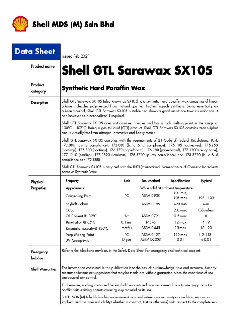 Shell GTL Sarawax SX105 Data Sheet | PDF | Wax | Alkane