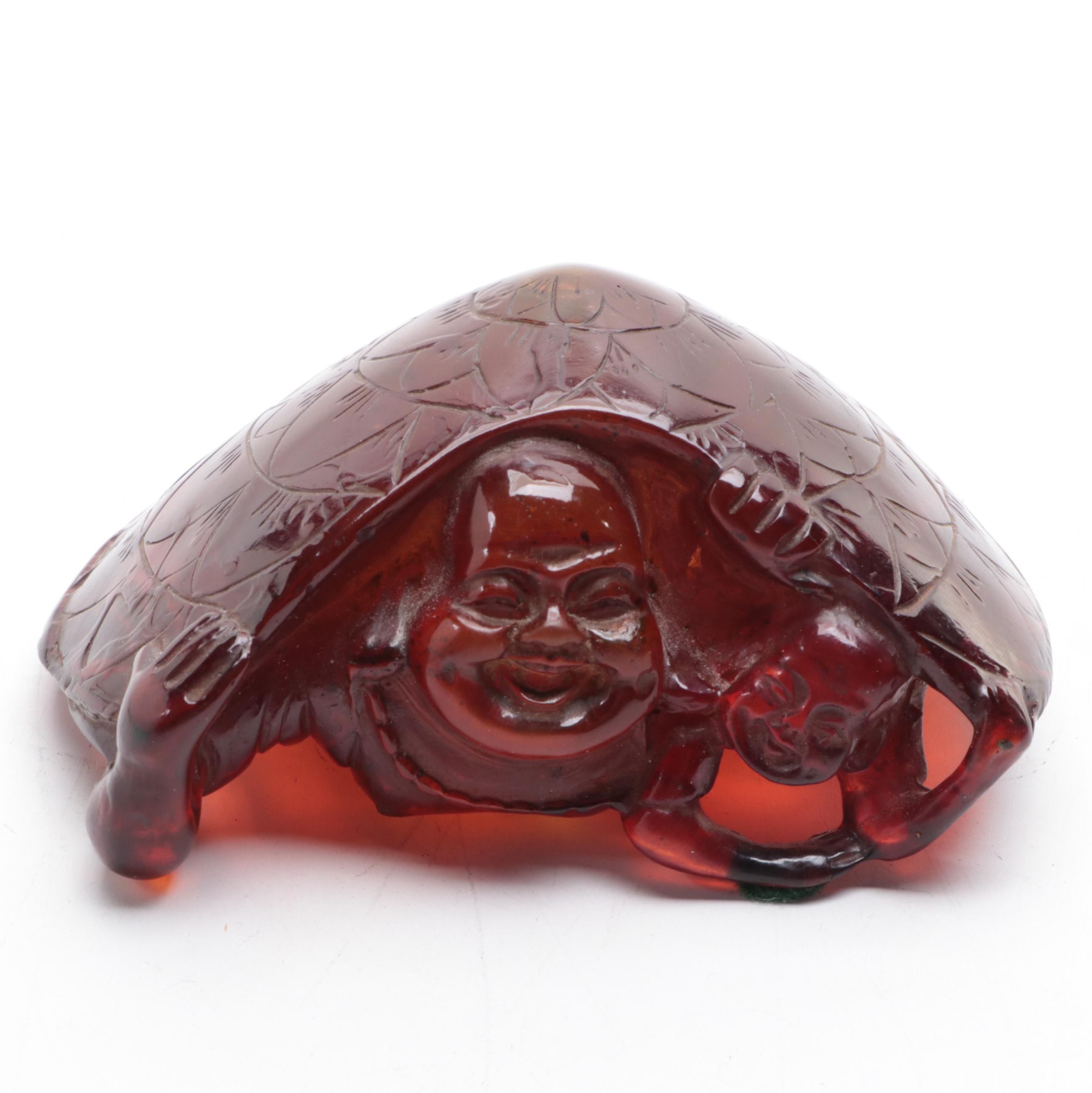 Chinese Carving of Buddha and Figure Hiding Under Turtle Shell | EBTH