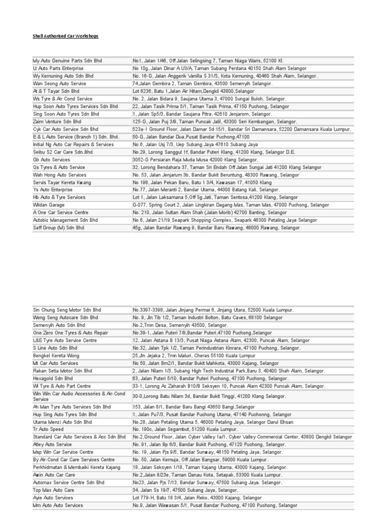 Shell Authorised Car Workshops (25sept) | PDF