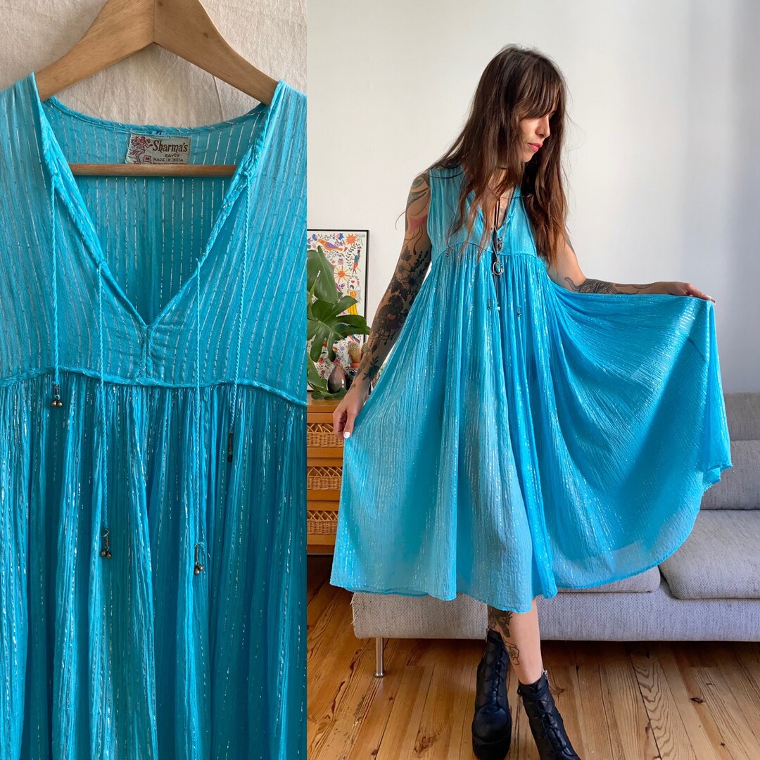 Vintage Shiny Gauze Rayon Indian Turquoise Dress // Size M - Etsy