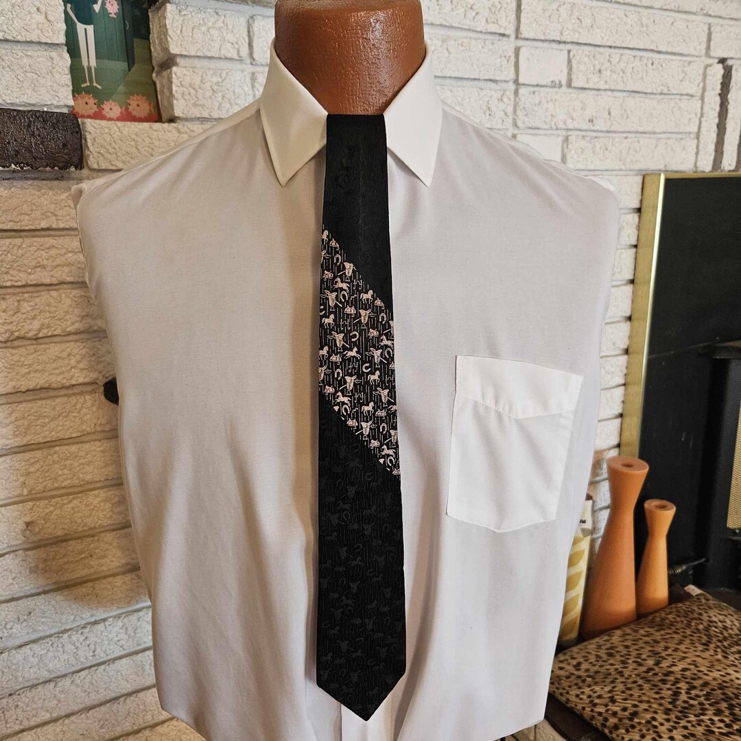 1960's Black Shiny Rayon Tie With Pink and Black Embossed Horse and ...