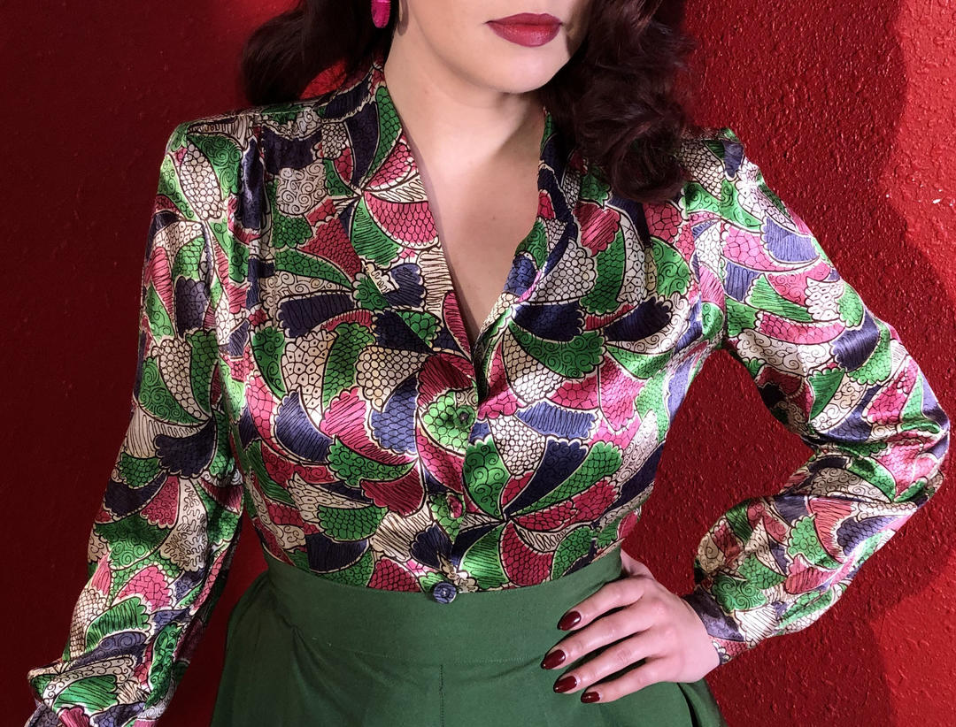 1940s Shiny Rayon Blouse Fuchsia and Green Shawl Collar Abstract | The ...