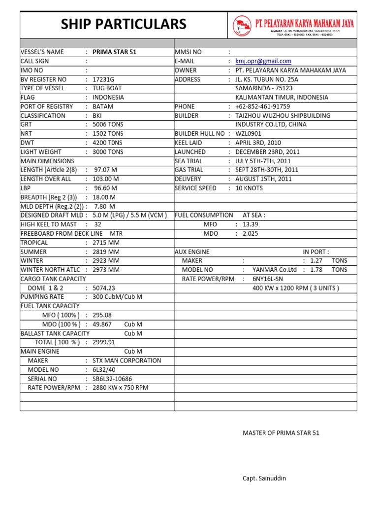 Ship Particulars Tb. Prima Star 51 | PDF | Shipping | Ships