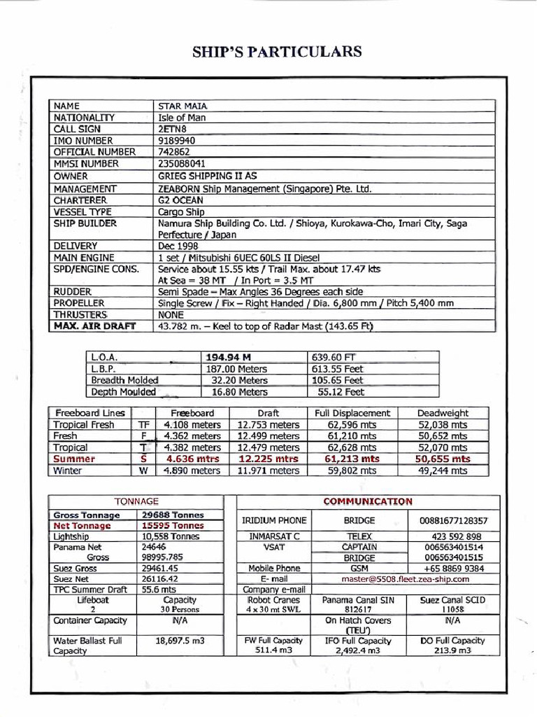 MV Star Maria - Ship Particulars | PDF